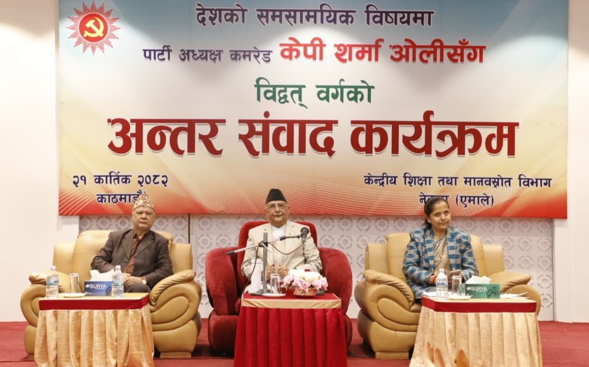 एमाले केन्द्रीय शिक्षा तथा मानवस्रोत विभागद्वारा शुक्रबार यहाँ आयोजित विद्वत वर्गको अन्तरसंवाद कार्यक्रममा उहाँले सो कुरा बताउनुभएको हो । उहिले सुकरात त कठिन परिस्थितिमा भागेर नगएको उदाहरण दिनुहुँदै भन्नुभयो, “देश बनाउन राजनीतिमा आएको हुँ, देश छाडेर कहीँ भाग्दैन ।”