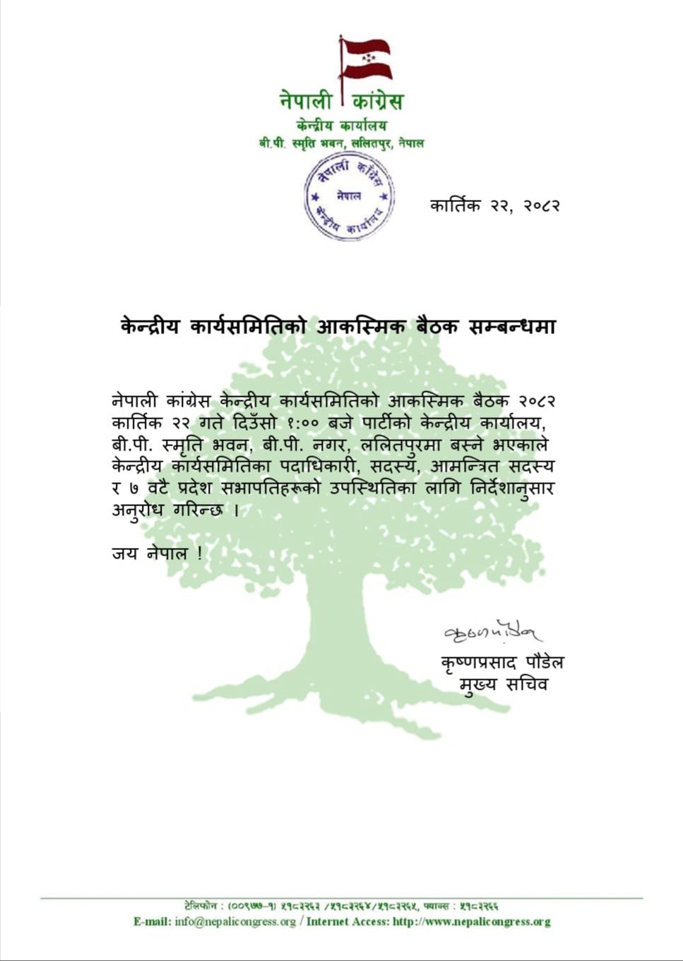 काठमाडौँ, कात्तिक २२ गते । नेपाली कांग्रेस केन्द्रीय कार्यसमितिको आकस्मिक बैठक बस्दै छ । शनिबार दिउँसो १ बजे पार्टी केन्द्रीय कार्यालयमा बैठक बस्ने मुख्य सचिव कृष्णप्रसाद पौडेलले जानकारी दिनुभयो ।