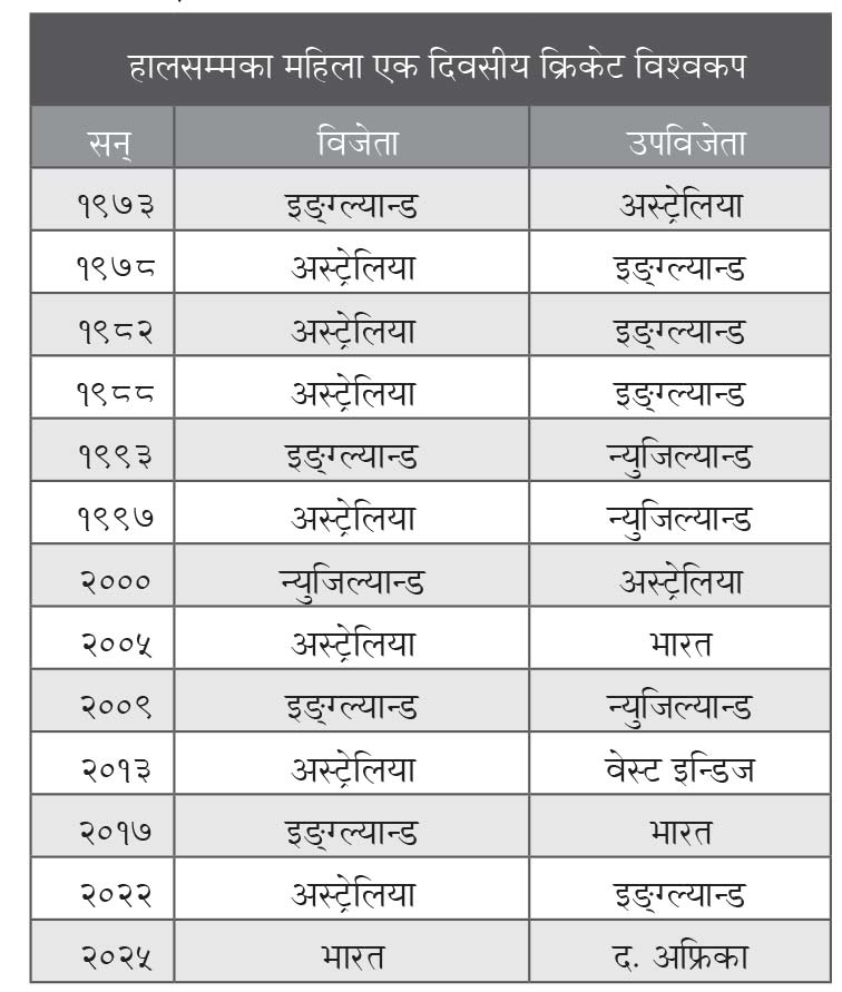 भारतीय महिला क्रिकेट टोली एकदिवसीय विश्वकपको नयाँ विजेता बनेको ।