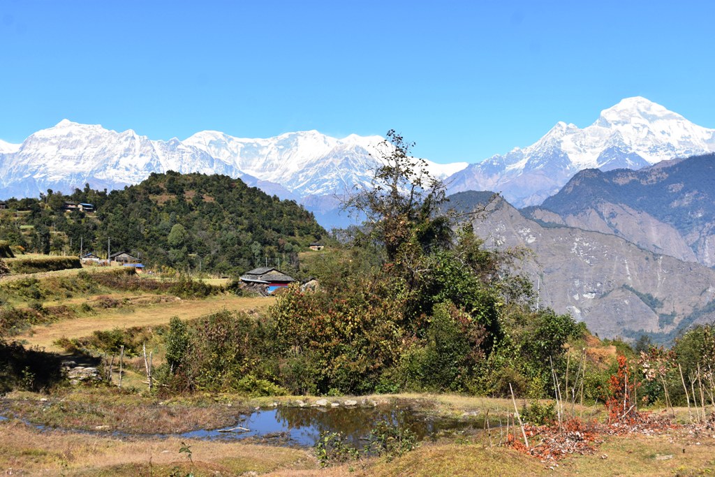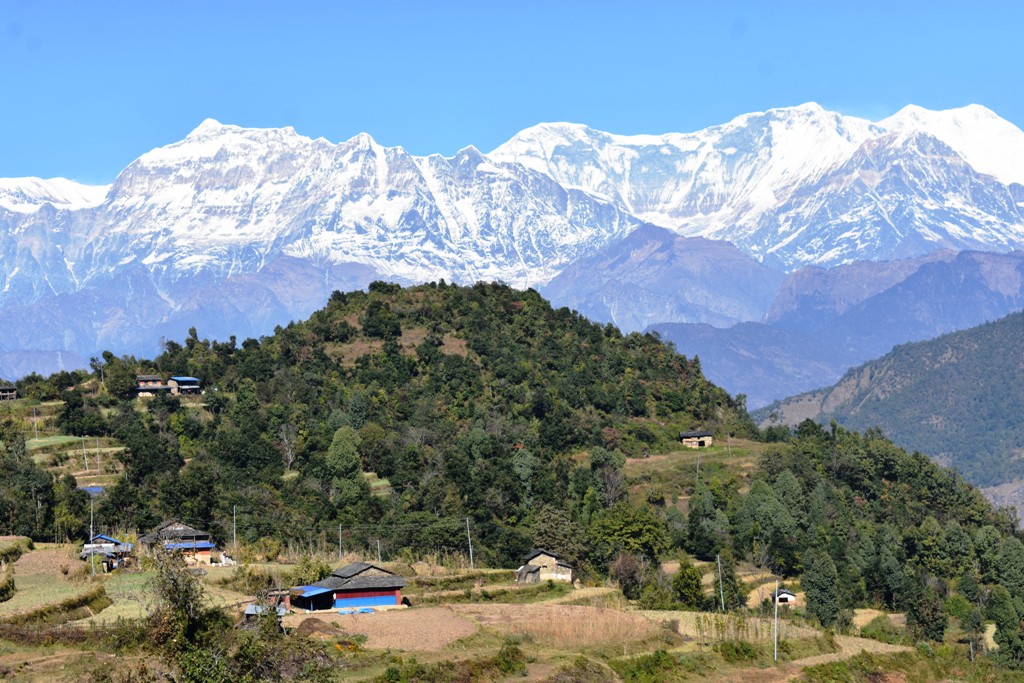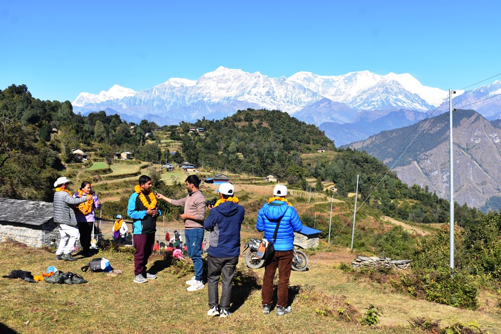 पर्यटकीय स्थल चाङ्गा खर्कमा पुगेका आन्तरिक पर्यटक र हिमालको दृश्य । तस्बिर : ठाकुरप्रसाद आचार्य