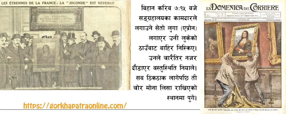 सन् १९११ लुभाका एक पूर्वकर्मचारीले इतिहासको सबैभन्दा ठुलो कला चोरी अपराध गरे : लियोनार्डो डा भिन्चीको अमर पेन्टिङ मोना लिसाको चोरी ।
