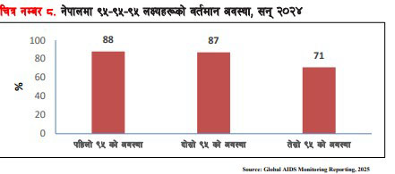 ३८ औँ विश्व एड्स दिवसको अवसरमा राष्ट्रिय एड्स तथा यौन रोग नियन्त्रण केन्द्रले सार्वजनिक गरेको तथ्याङ्कले कुल एचआइभी सङ्क्रमित मध्ये ७७ प्रतिशत उपचारमा रहेका छन् ।