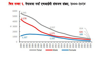 उहाँ भन्नुहुन्छ, “एचआइभीको अवस्थालाई केन्द्रिकृत महामारीको रूपमा छ । यसको अर्थ एक वा सो भन्दा बढी एचआइभी सर्न सक्ने जोखिममा रहेका समूहमा एचआइभी सङ्क्रमण दर पाँच प्रतिशत भन्दा बढी तर, सामान्य जनसङ्ख्या वा प्रसूति सेवा लिएका गर्भवतीमा एचआइभी सङ्क्रमण दर एक प्रतिशत भन्दा कम हो ।”