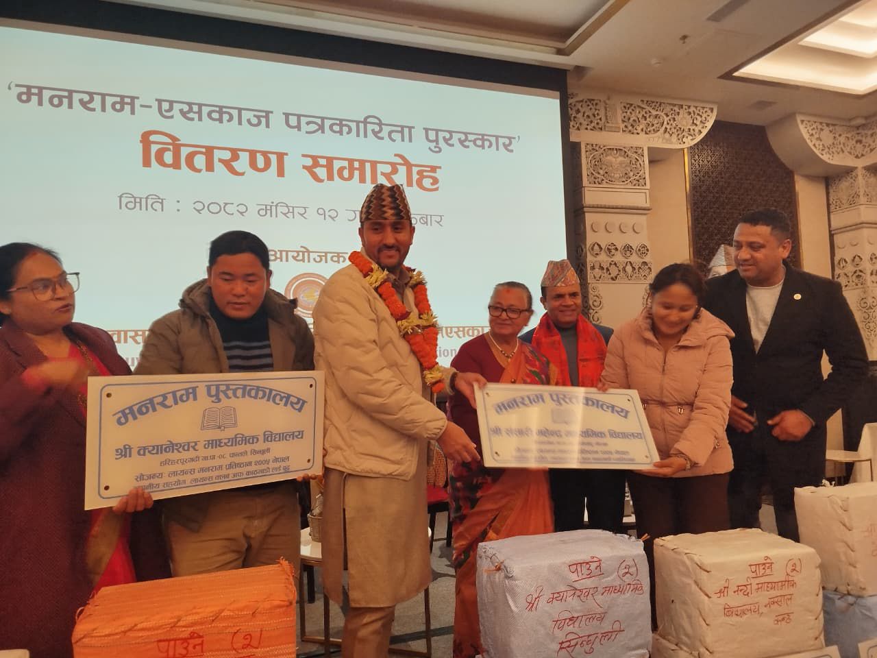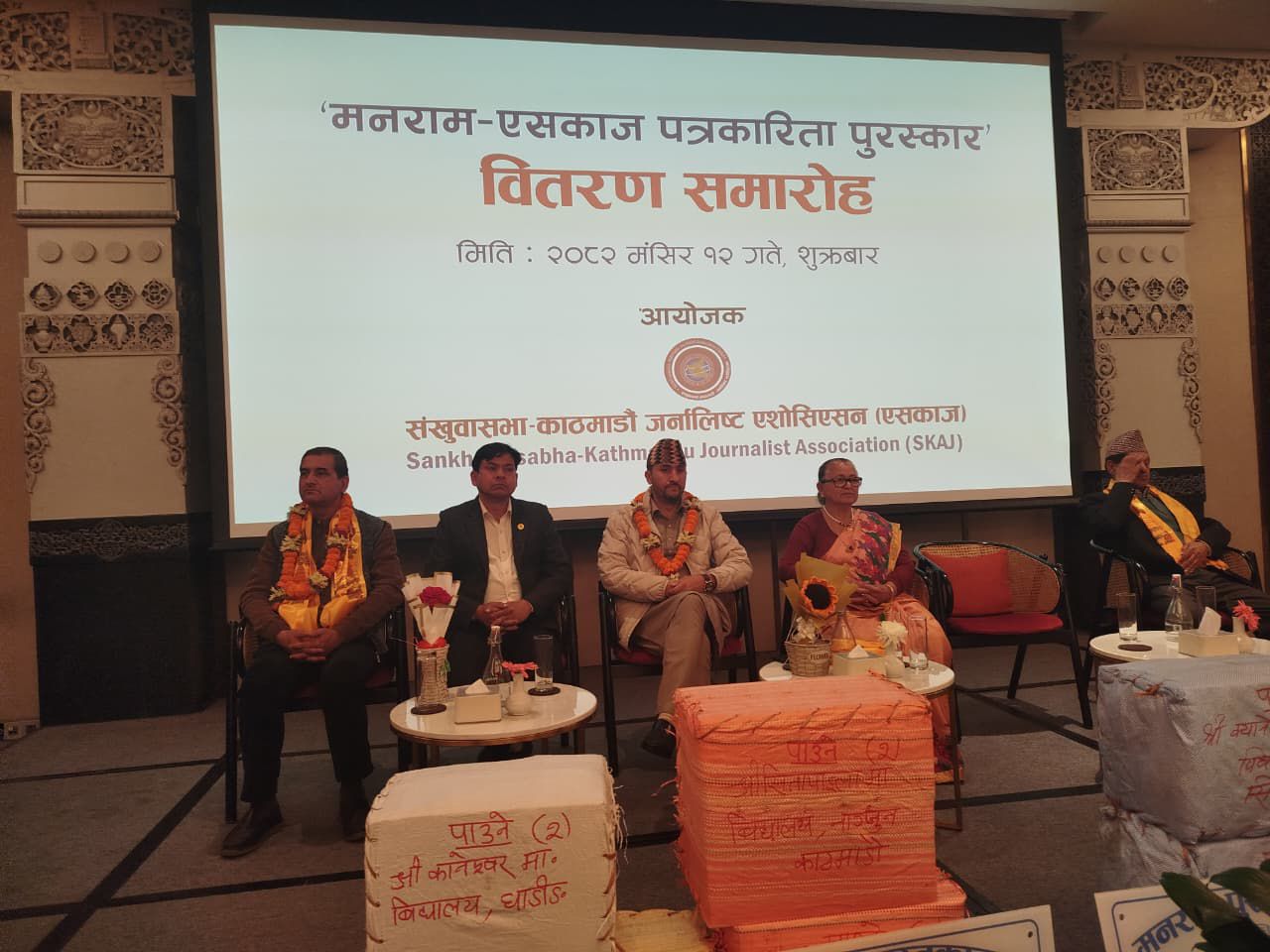 यस वर्षको मनराम–एसकाज पत्रकारिता पुरस्कार वरिष्ठ पत्रकार गोविन्द पोखरेललाई प्रदान गरिएको छ । आयोजककोतर्फबाट सञ्चारमन्त्री खरेलले उक्त पुरस्कार वितरण गर्नुभएको हो । लामो समयदेखि निरन्तर रूपमा पत्रकारिता र लेखन क्षेत्रमार्फत समाज तथा संखुवासभाको पहिचान, विकास र सुदृढीकरणमा पुर्याएको योगदानका आधारमा उहाँलाई सम्मान गरिएको हो ।