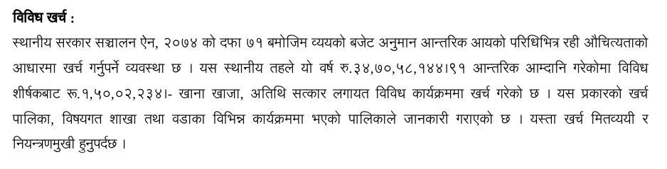 त्यस्तै खाना खाजा र अतिथि सत्कारमा एक करोड ५० लाख दुई हजार २३४ रुपियाँ खर्च गरेको छ । स्थानीय सरकार सञ्चालन ऐन, २०७४ को दफा ७१ बमोजिम व्ययको बजेट अनुमान आन्तरिक आयको परिधिभित्र रही औचित्यताको आधारमा खर्च गर्नुपर्ने व्यवस्था भए पनि त्यसको विपरीत विविध शीर्षकबाट खाना खाजा, अतिथि सत्कारलगायत विविध कार्यक्रममा खर्च गरेको छ ।