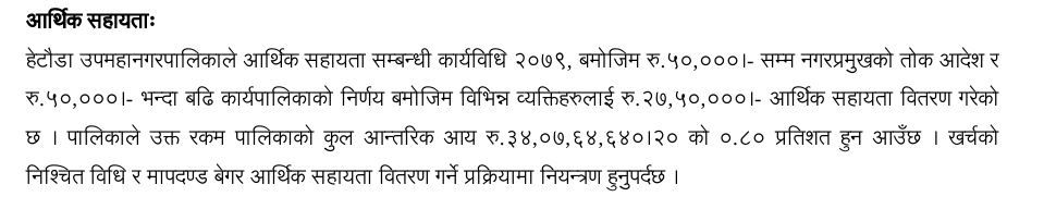 हेटौँडा उपमहानगरपालिकामा मनपरी ढङ्गले आर्थिक सहायता वितरण गरिएको पाइएको छ । आव २०८०/०८१ को लेखा परीक्षण प्रतिवेदनमा उल्लेख भएअनुसार मनपरी ढङ्गले तोक आदेशमा विभिन्न व्यक्तिलाई २७ लाख ५० हजार आर्थिक सहायता वितरण गरिएको छ । आर्थिक सहायतासम्बन्धी कार्यविधि २०७९, बमोजिम ५० हजारसम्म नगरप्रमुखको तोक आदेश र ५० हजारभन्दा माथि कार्यपालिकाको निर्णय बमोजिम दिने उल्लेख भए पनि खर्चको निश्चित विधि र मापदण्ड बेगर आर्थिक सहायता वितरण भएको महालेखाको प्रतिवेदनमा उल्लेख छ ।