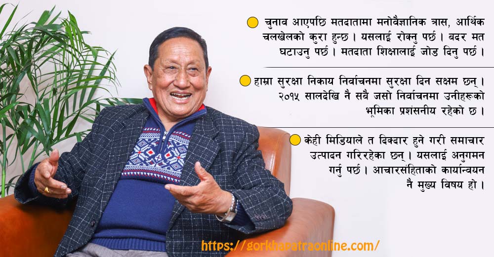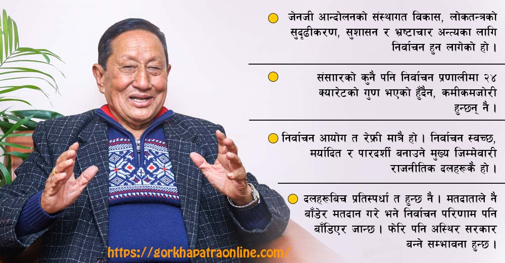आगामी फागुन २१ गते प्रतिनिधि सभा निर्वाचन हुँदै छ । निर्वाचनका लागि सरकार, निर्वाचन आयोग तथा सुरक्षा निकायले आआफ्ना तयारी तीव्र बनाइरहेका छन् । २०६४ र २०७० सालको संविधान सभा निर्वाचन सफलतापूर्वक सम्पन्न गरेको अनुभव बटुलेका पूर्वप्रमुख कार्यवाहक निर्वाचन आयुक्त दोलखबहादुर गुरुङ अहिले निर्वाचनको तयारी सन्तोषजनक रहेको बताउनुहुन्छ । निर्वाचन सफल पार्न सरकार, निर्वाचन आयोग र यससँग सरोकार राख्ने व्यक्ति तथा निकायको योगदान पनि उत्तिकै हुन आवश्यक रहेको गुरुङको भनाइ छ । निर्वाचनका समग्र विषयमा केन्द्रित रहेर गुरुङसँग गोरखापत्र दैनिकका लागि नारद गौतम र सूर्यप्रसाद पाण्डेले गर्नुभएको कुराकानीको सम्पादित अंश :