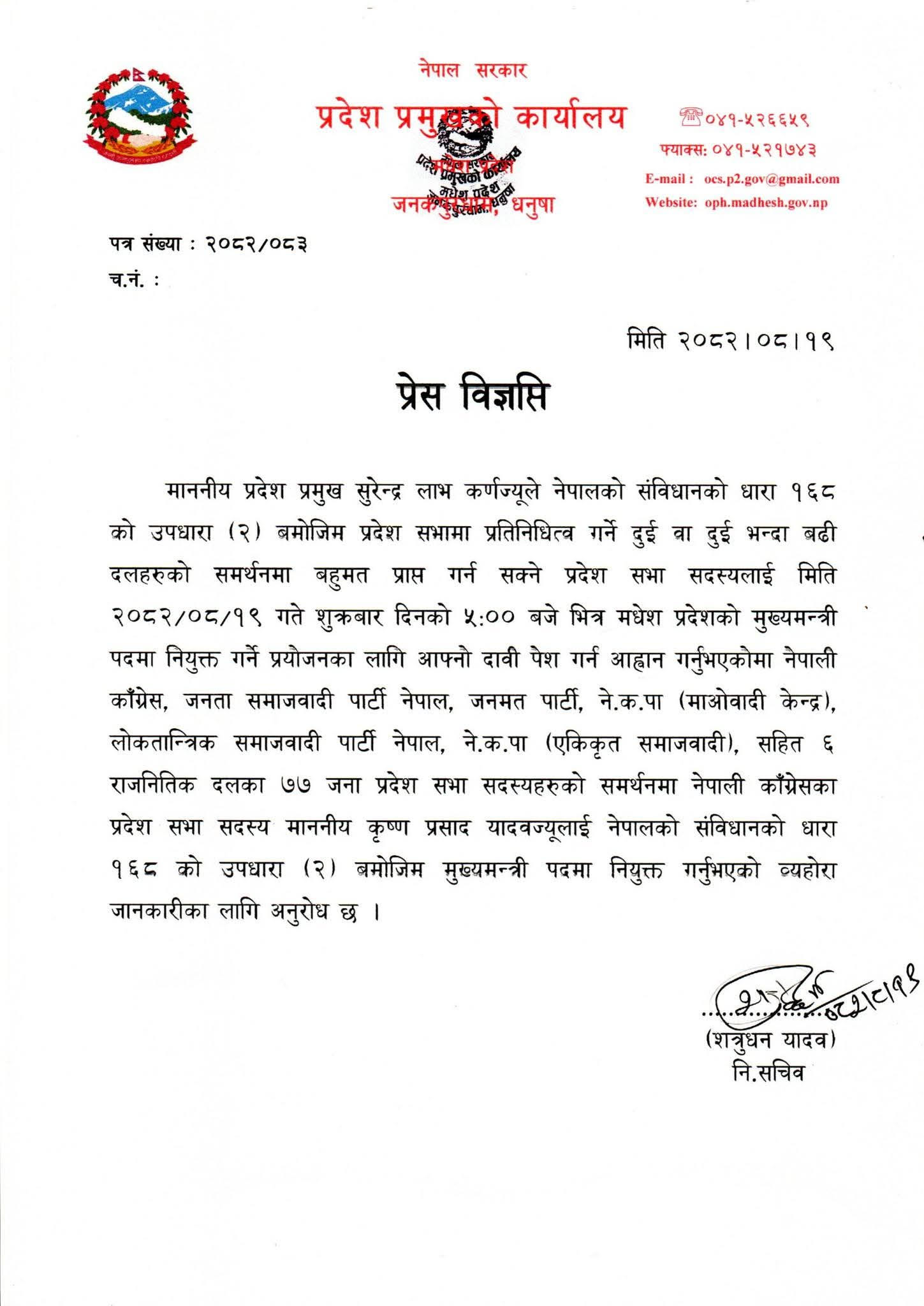 प्राप्त दाबीको परीक्षणपछि प्रदेश प्रमुखले यादवलाई संविधानको व्यवस्थाअनुसार मधेश प्रदेशका मुख्यमन्त्री नियुक्त गरेको कार्यालयले जनाएको छ।