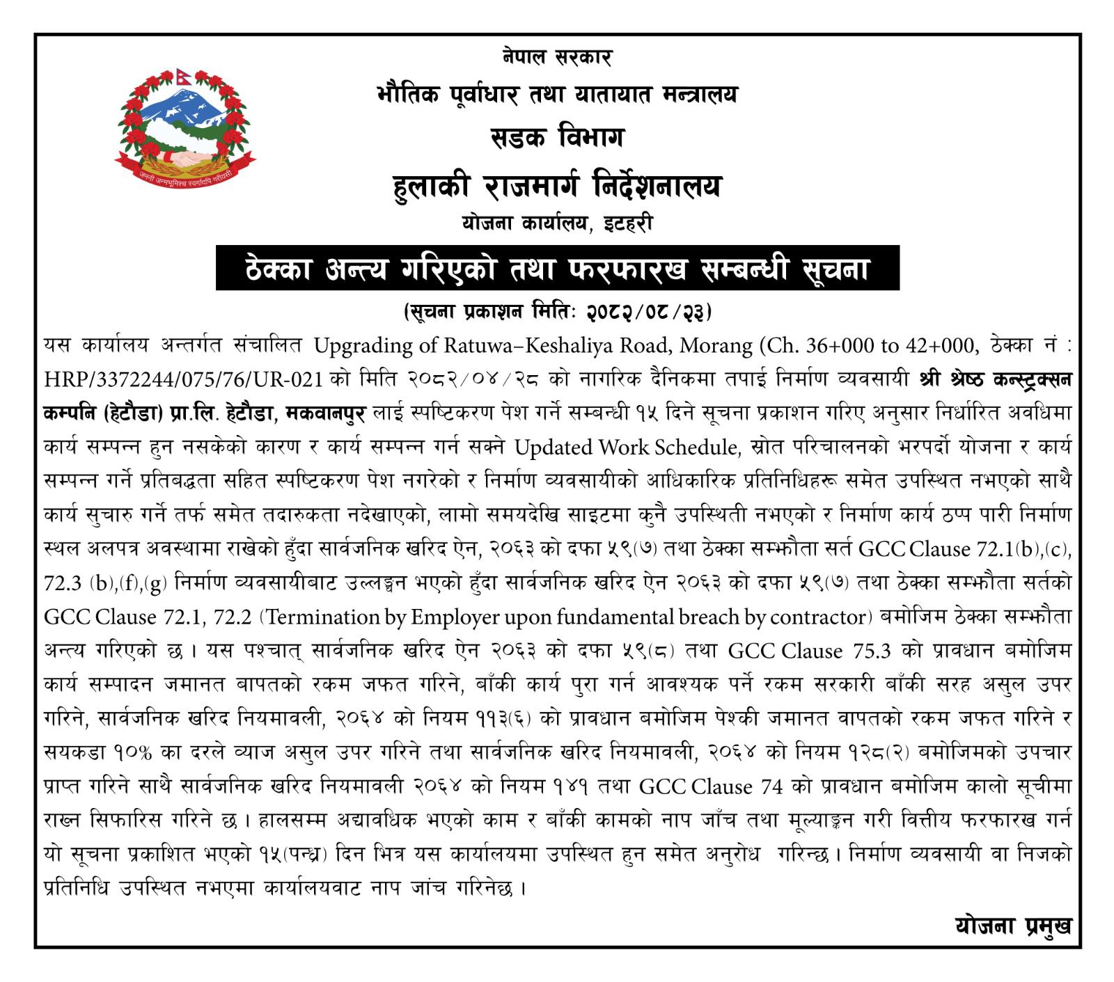 सडक विभाग मातहतको हुलाकी राजमार्ग निर्देशनालयअन्तर्गत योजना कार्यालय इटहरीले मङ्गलबार सडक निर्माणका लागि श्रेष्ठ कन्स्ट्रक्सन कम्पनी प्रा.लि. हेटौंडासँगको ठेक्का सम्झौता अन्त्य गरिएको सार्वजनिक सूचना जारी गरेको छ ।