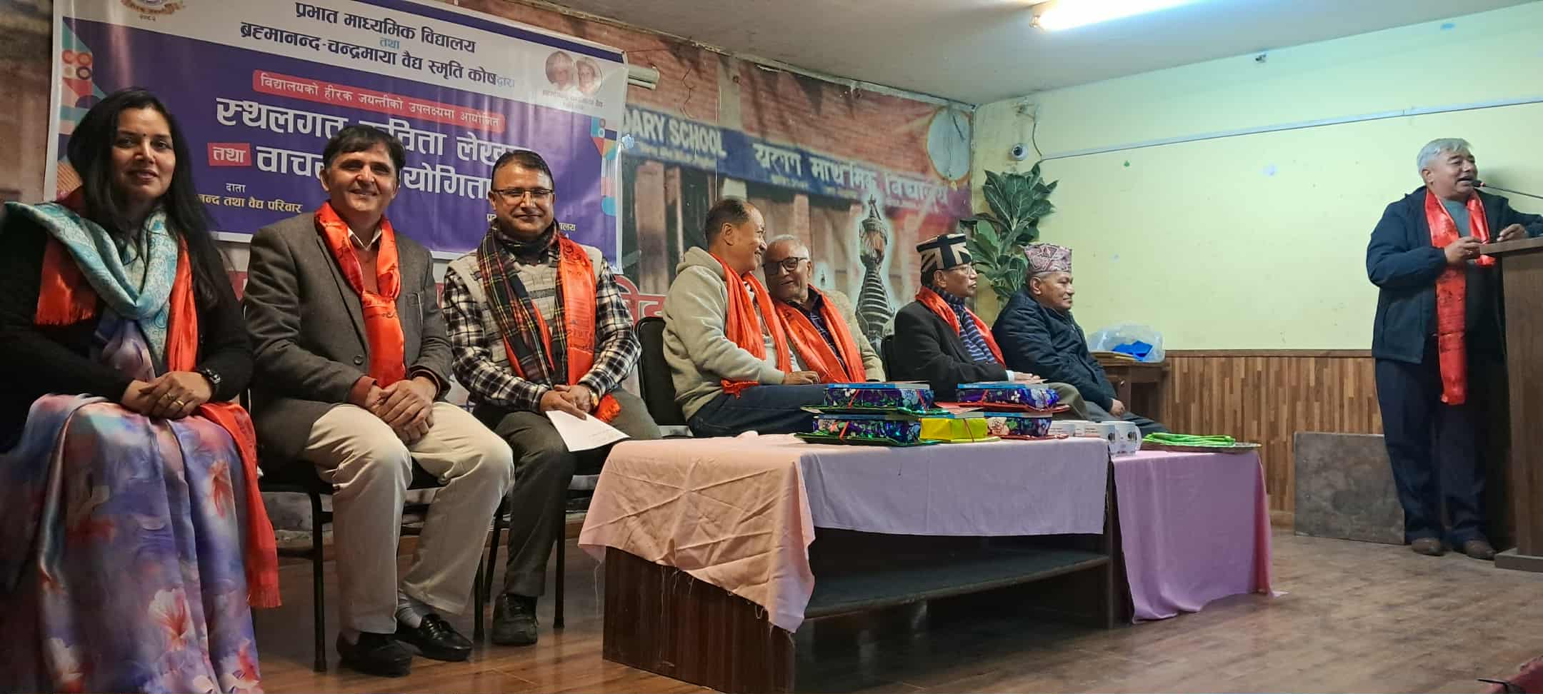 कठमाडौँ, मङ्सिर २४ गते । प्रभात माध्यमिक विद्यालय,नःघको हीरक जयन्तीको पूर्वसन्ध्यामा काठमाडौँ उपत्यकाव्यापी माध्यमिक विद्यालयस्तरीय स्थलगत कविता लेखन प्रतियोगिता सम्पन्न भएको छ । सो विद्यालय र ब्रह्मानन्द–चन्द्रमाया वैद्य स्मृति कोषद्वारा आयोजित कविता प्रतियोगितामा वाचनका लागि चयन भएका विभिन्न विद्यालयका १४ बाल कविहरूले रचना वाचन गर्नुभयो ।