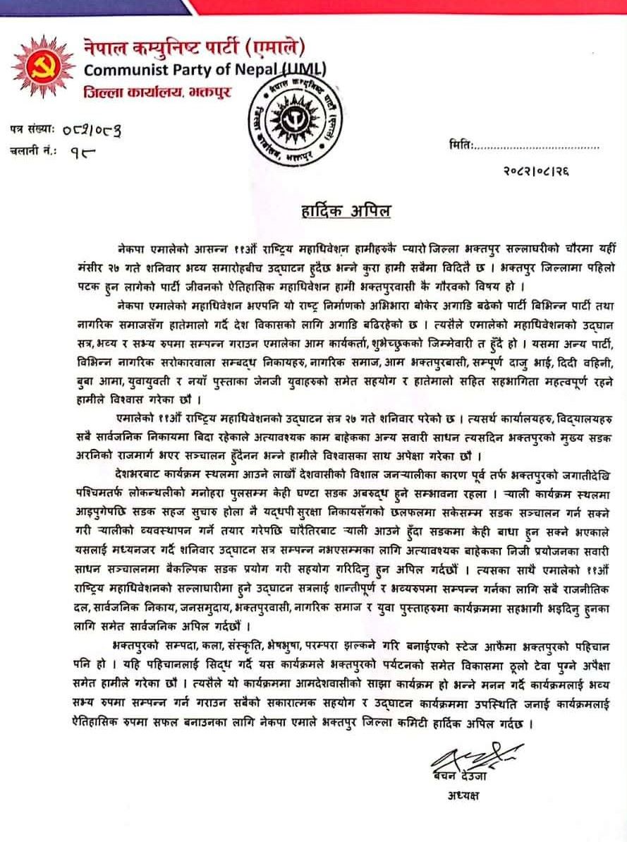 पहिलो पटक भक्तपुरमा आयोजना हुन लागेको एमाले इतिहासकै महत्त्वपूर्ण महाधिवेशनका कारण जिल्लाभरि उत्साहजनक चहलपहल बढेको एमाले भक्तपुरका अध्यक्ष वचन देउजाले बताउनुभएको छ । एमाले भक्तपुर जिल्ला कमिटीले आज सार्वजनिक अपिल जारी गर्दै जिल्लावासी, विभिन्न राजनीतिक दल, नागरिक समाज, पेशागत संगठन, युवायुवती तथा जेनजी पुस्तासमेतलाई उद्घाटन समारोहमा सहभागी भइ कार्यक्रम सफल बनाउन अनुरोध गरेको छ। जिल्ला कमिटीका अध्यक्ष देउजाले महाधिवेशनलाई ‘देश निर्माणको साझा अभियान’ का रूपमा सबैले साथ दिने विश्वास व्यक्त गर्नुभएको छ ।