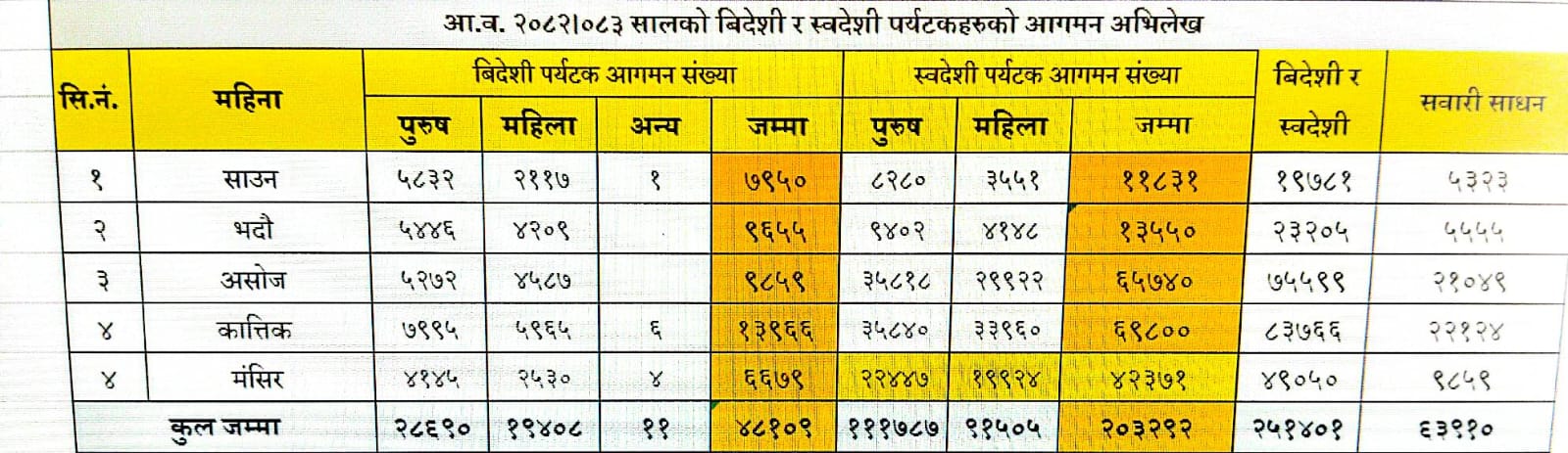 चालु आर्थिक वर्ष २०८२-०८३ सालको साउनदेखि मङ्सिर महिनासम्मको अवधिमा २ लाख ५१ हजार ४ सय १ जना स्वदेशी तथा विदेशी पर्यटकले मुस्ताङको भ्रमण गरेका छन् ।