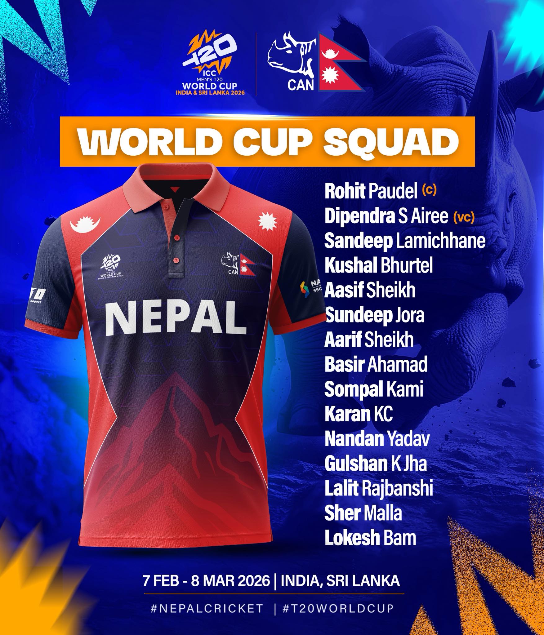 मंगलबार क्यानले १५ सदस्यीय टोली घोषणा गरेको हो। रोहित पौडेलको कप्तानीमा एनपिएल सिजन २ मा उत्कृष्ट प्रदर्शन गरेका शेर मल्ल पहिलो पटक समावेश हुनुभएको छ। नयाँ खेलाडीमा बसिर अहमद विश्वकप टोलीमा पर्दा कुशल मल्ल र आदिल आलम छुट्नुभएको छ।