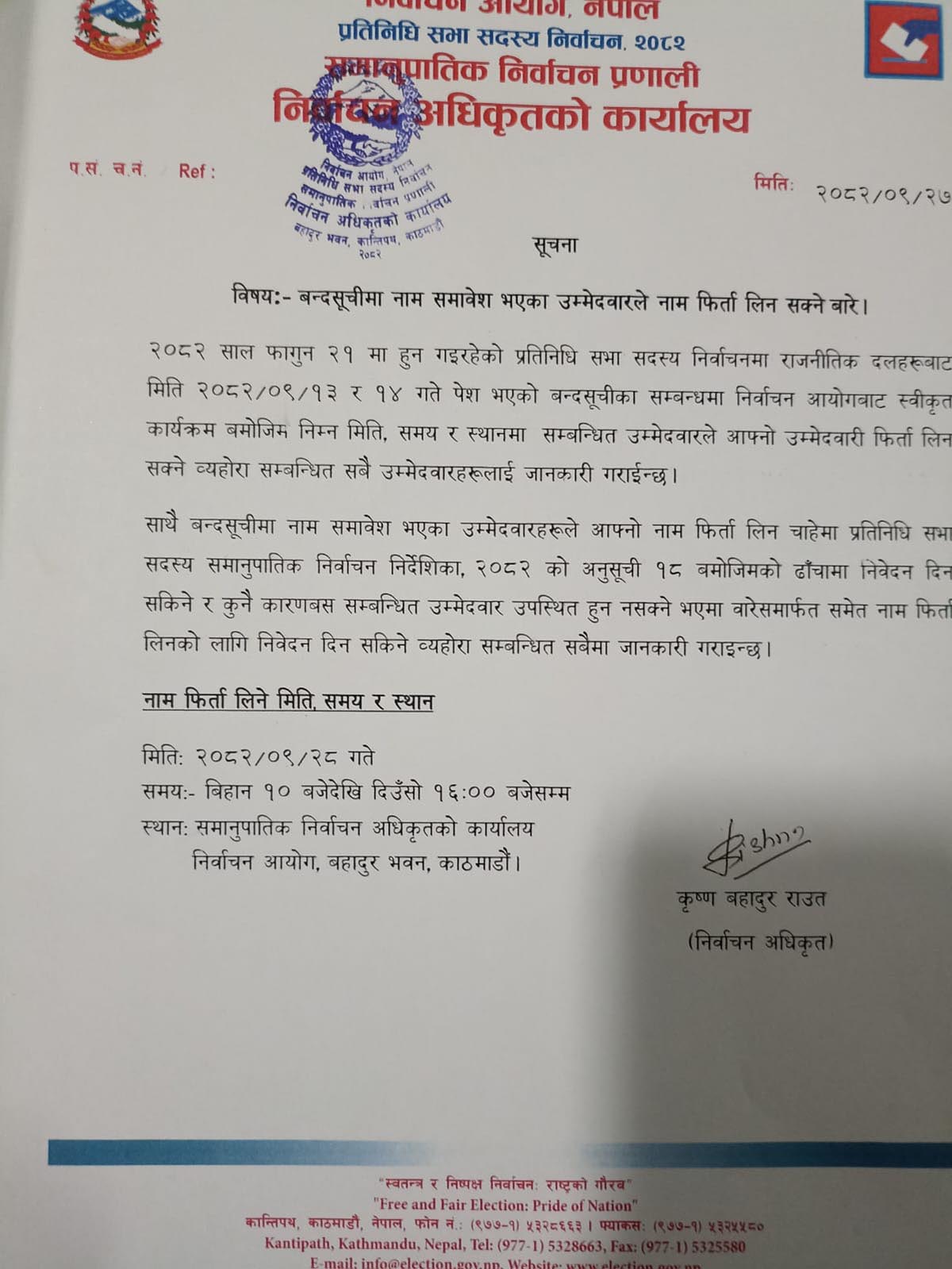 समानुपातिक निर्वाचन प्रणालीका निर्वाचन अधिकृत कृष्णबहादुर राउतका अनुसार २०८२ पुस १३ र १४ गते पेस भएको बन्दसूचीका सम्बन्धमा निर्वाचन आयोगबाट स्वीकृत कार्यक्रम बमोजिम पुस २८ गते सोमबार बिहान १० बजेदेखि अपरान्ह ४ बजेसम्म उम्मेदवारले नाम फिर्ता लिन सक्नेछन्।