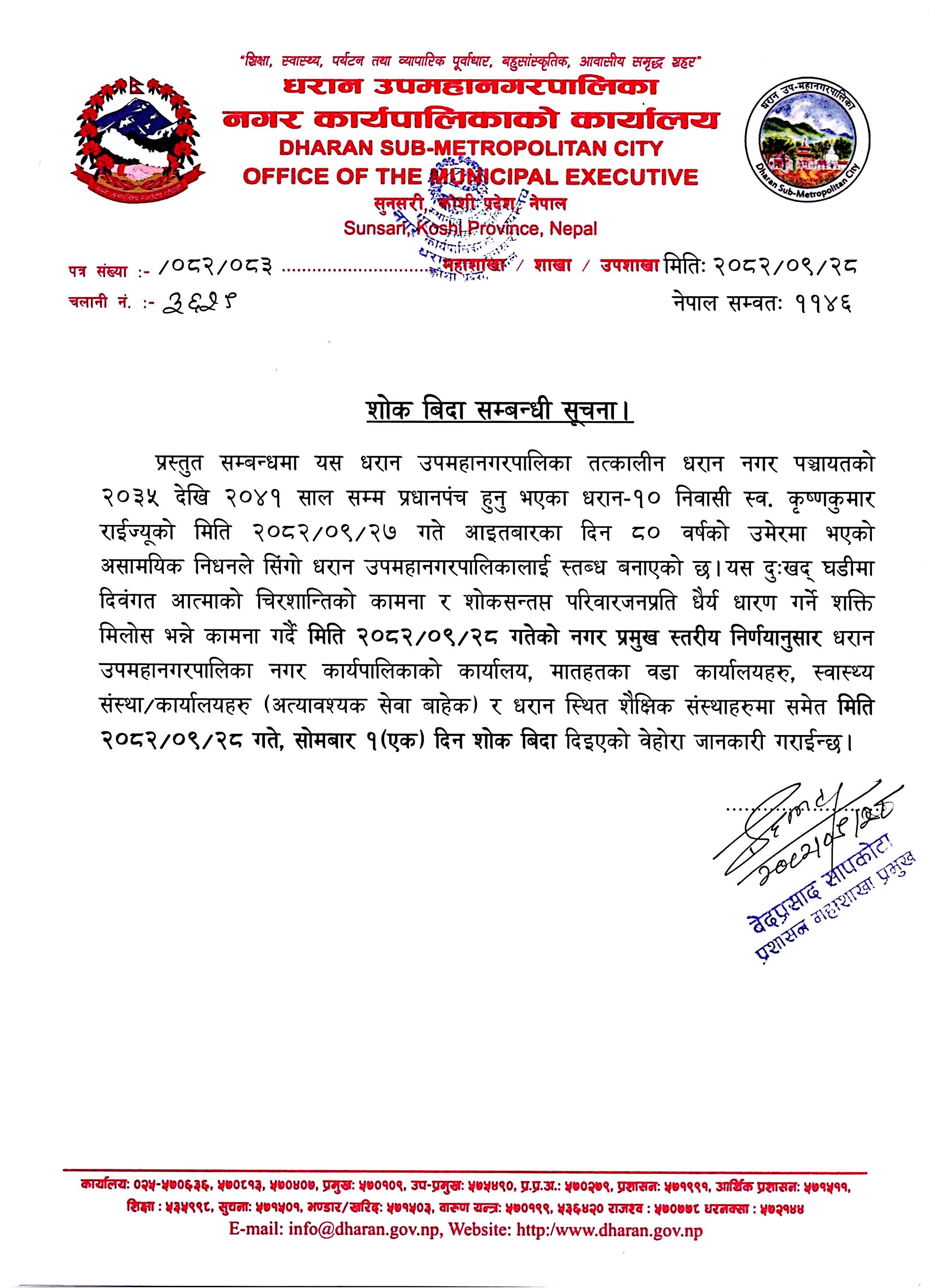 प्रधानपञ्च राईको निधनमा नगर प्रमुखस्तरीय निर्णयबाट आज धरान उपमहानगरपालिकामा शोक बिदा दिइएको प्रशासन महाशाखाका प्रमुख वेदप्रसाद सापकोटाले जानकारी दिनुभयो । आज उपमहानगर कार्यालय, मातहतको स्वास्थ्य कार्यालय (अत्यावश्यक बाहेक), वडा कार्यालय र शैक्षिक संस्थाहरु बन्द रहेको उपमहानगरले जनाएको छ ।