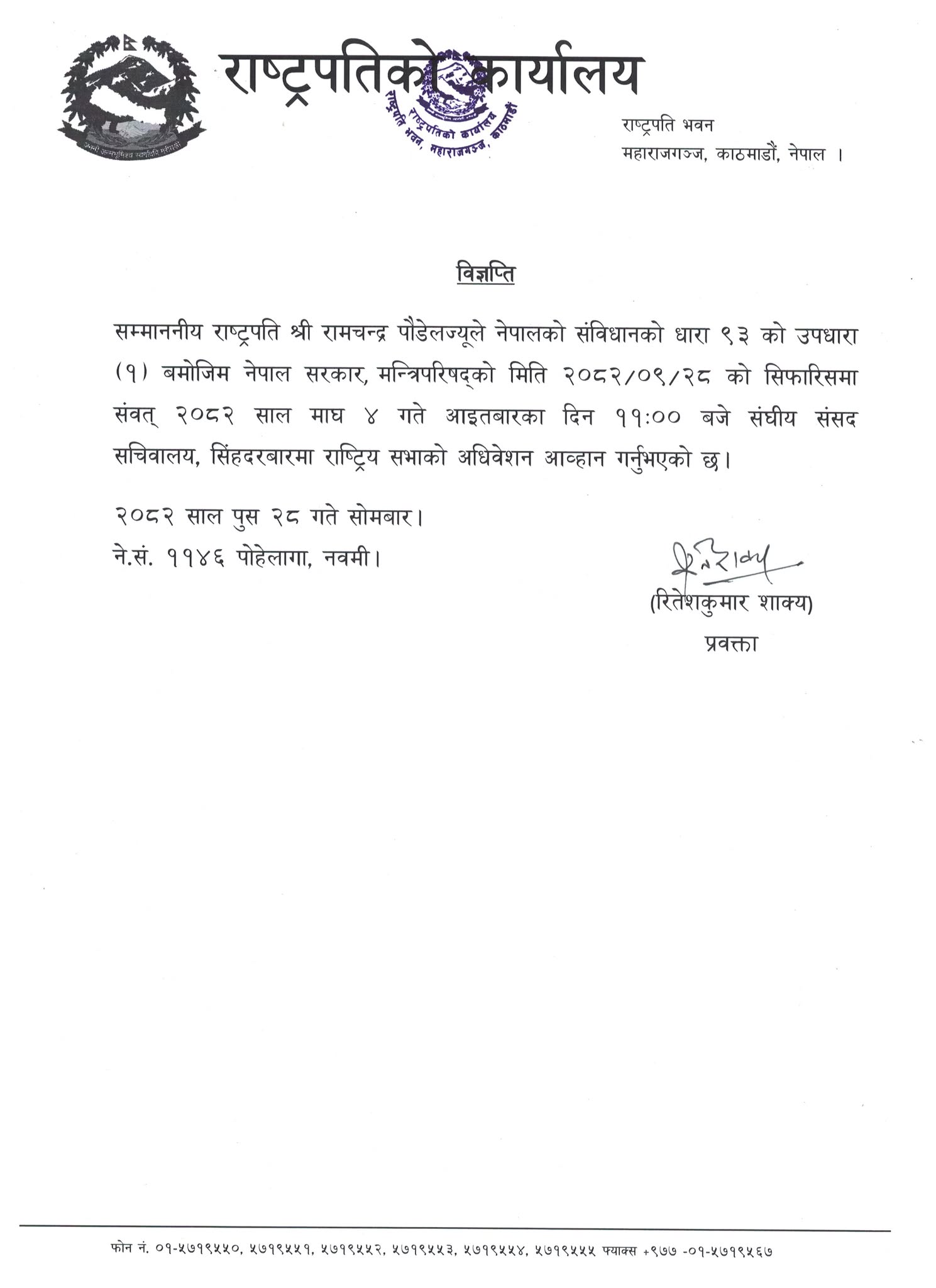 प्रवक्ता शाक्यद्वारा जारी गरिएको विज्ञप्तिमा लेखिएको छ, ‘सम्माननीय राष्ट्रपति श्री रामचन्द्र पौडेलज्यूले नेपालको संविधानको धारा ९३ को उपधारा (१) बमोजिम नेपाल सरकार, मन्त्रिपरिषद्को मिति २०८२ पुस २८ को सिफारिसमा संवत् २०८२ साल माघ ४ गते आइतबारका दिन ११ बजे सङ्घीय संसद सचिवालय, सिंहदरबारमा राष्ट्रिय सभाको अधिवेशन आह्वान गर्नुभएको छ ।’