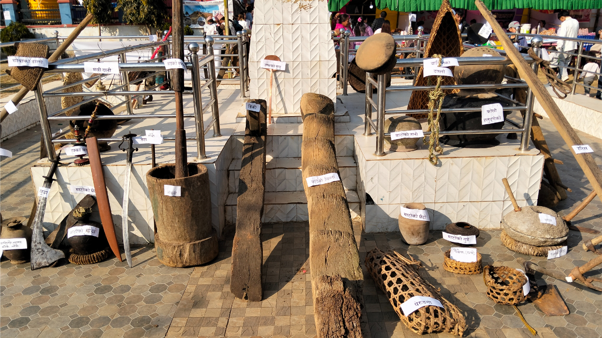 यो सँगै कृषि युग सुरु भएयता कृषि कर्ममा प्रयोग गरिएका औजार र जडिबुटी सँगै बन उद्यम सम्बन्धित बस्तुहरु प्रदर्शनीमा राखिएका छन्।