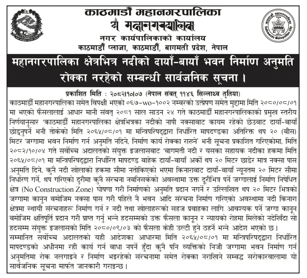 त्यस सूचनामा ‘महानगरपालिका क्षेत्रभित्रका नदीको नापी नक्सावाट कायम रहेको छेउवाट दायाँ बायाँ छोड्नुपर्ने भनी तोकेको मापदण्डका अतिरिक्त थप २० (बिस) मिटर जग्गामा भवन निर्माण गर्न अनुमति नदिने, निर्माण कार्य रोक्का राख्ने’ विषय उल्लेख थियो ।