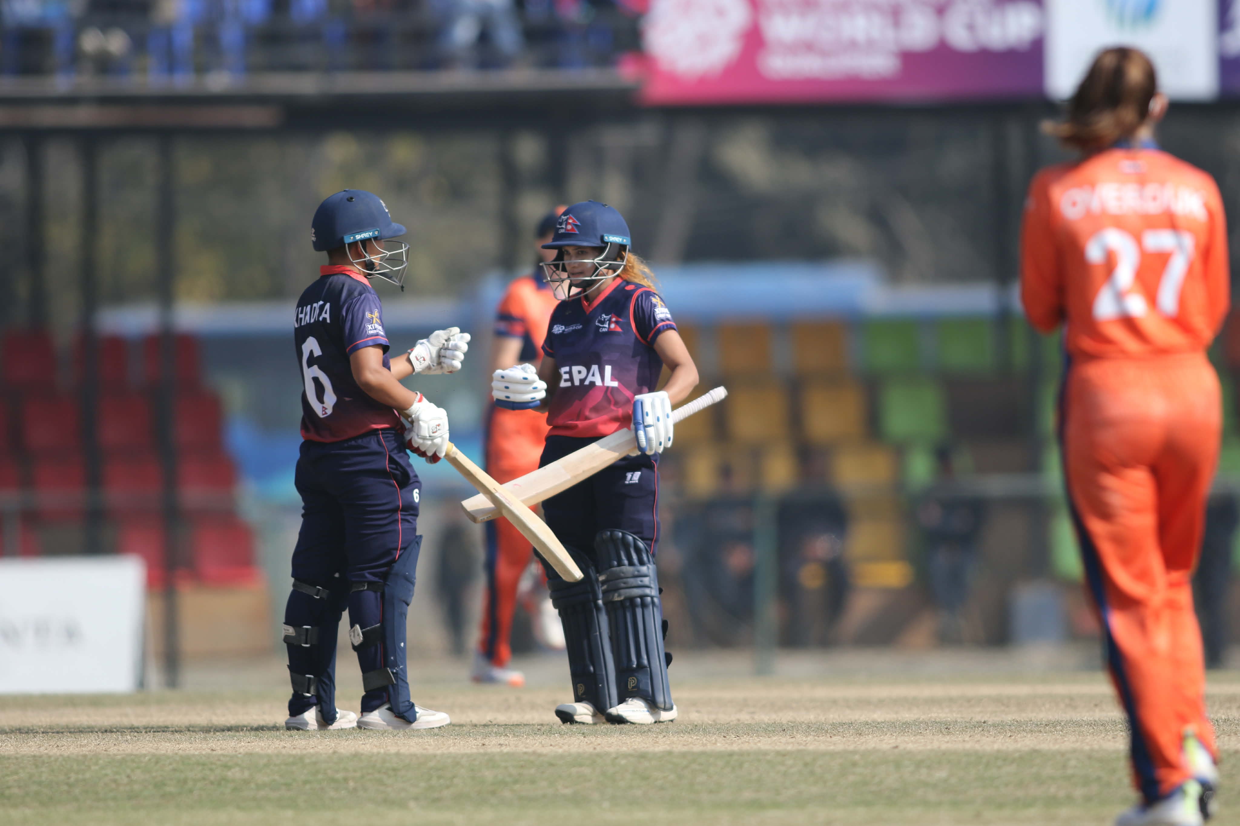 सिता रानामगरले अविजिता २७ र बिन्दु रावलले १८ रन बनाउनुभयो । बलिङमा नेदरल्यान्ड्सकी इसाबेल भान डर वोनिङले तीन तथा सिल्भर सिगर्स, रोबिन रिके र कारोलिन डे लाङले एक एक विकेट लिनुभयो ।