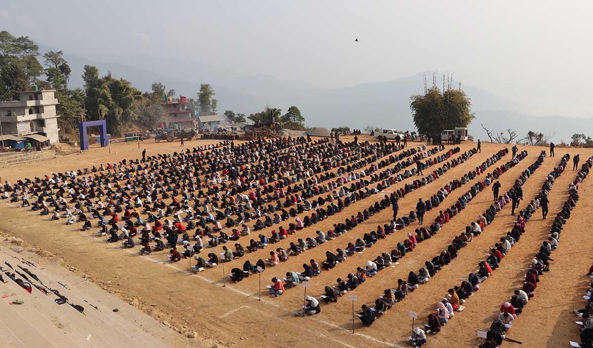 आगामी फागुन २१ गते हुने प्रतिनिधिसभा सदस्य निर्वाचनका लागि सङ्खुवासभामा आवेदन दिइएका निर्वाचन प्रहरी छनोटका लागि खाँदबारी रङ्गशालामा आज परीक्षा लिइँदै । जिल्लामा निर्वाचन प्रहरीका लागि एक हजार ३४ जनाको माग गरिएको छ । तस्बिरः भविन कार्की/रासस