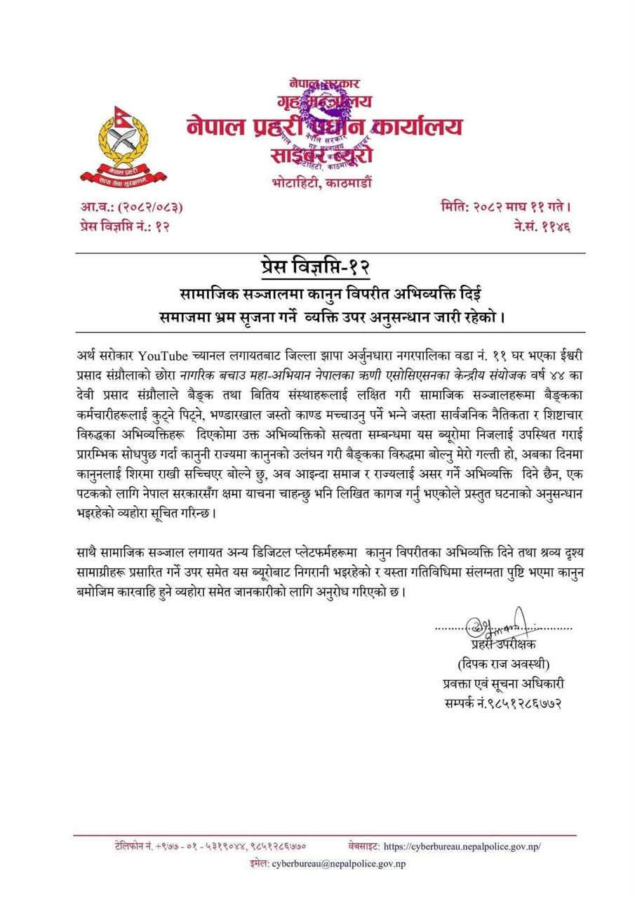 साथै साइबर ब्युरोले सामाजिक सञ्जाल तथा अन्य डिजिटल प्लेटफर्ममार्फत कानूनविपरीत अभिव्यक्ति दिन तथा श्रव्य–दृश्य सामग्री प्रसारण गर्ने कार्यमा संलग्न भए कानुनबमोजिम कारबाही हुने चेतावनी दिएको छ । यस्ता गतिविधिमा संलग्नता पुष्टि भएमा प्रचलित कानुनअनुसार कारबाही गरिने ब्युरोले पुनः जानकारी गराएको छ ।