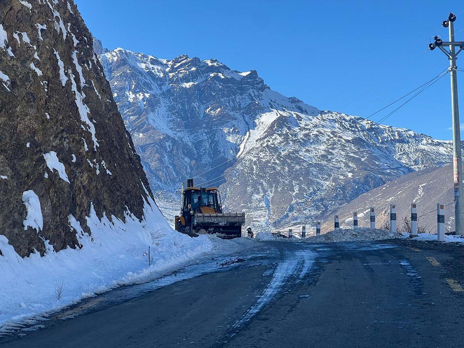 मुस्ताङको वारागुङ मुक्तिक्षेत्र गाउँपालिका–४ कागबेनीदेखि मुक्तिनाथ सडकखण्डमा जमेको हिउँ डोजरले पन्छाएर सडक खुलाइँदै । गत मङ्गलबार राति परेको हिउँ नपग्लिदा मुस्ताङ घुम्न आएका आन्तरिक तथा बाह्य पर्यटकलाई समस्या भएको थियो । वडाको पहलमा बुधबार बिहानैदेखि सडकको हिउँ पन्छाउने काम भइरहेको छ । तस्बिरः सुशीलबाबु थकाली/रासस