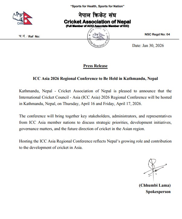 काठमाडौँ, माघ १६ गते। अन्तर्राष्ट्रिय क्रिकेट परिषद् (आइसिसी)को एसिया क्षेत्र २०२६ को सम्मेलन नेपालमा आयोजना हुने नेपाल क्रिकेट सङ्घ (क्यान)ले जनाएको छ।