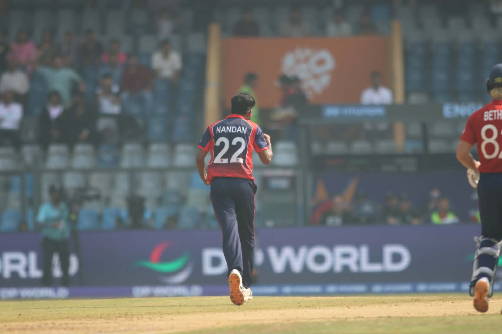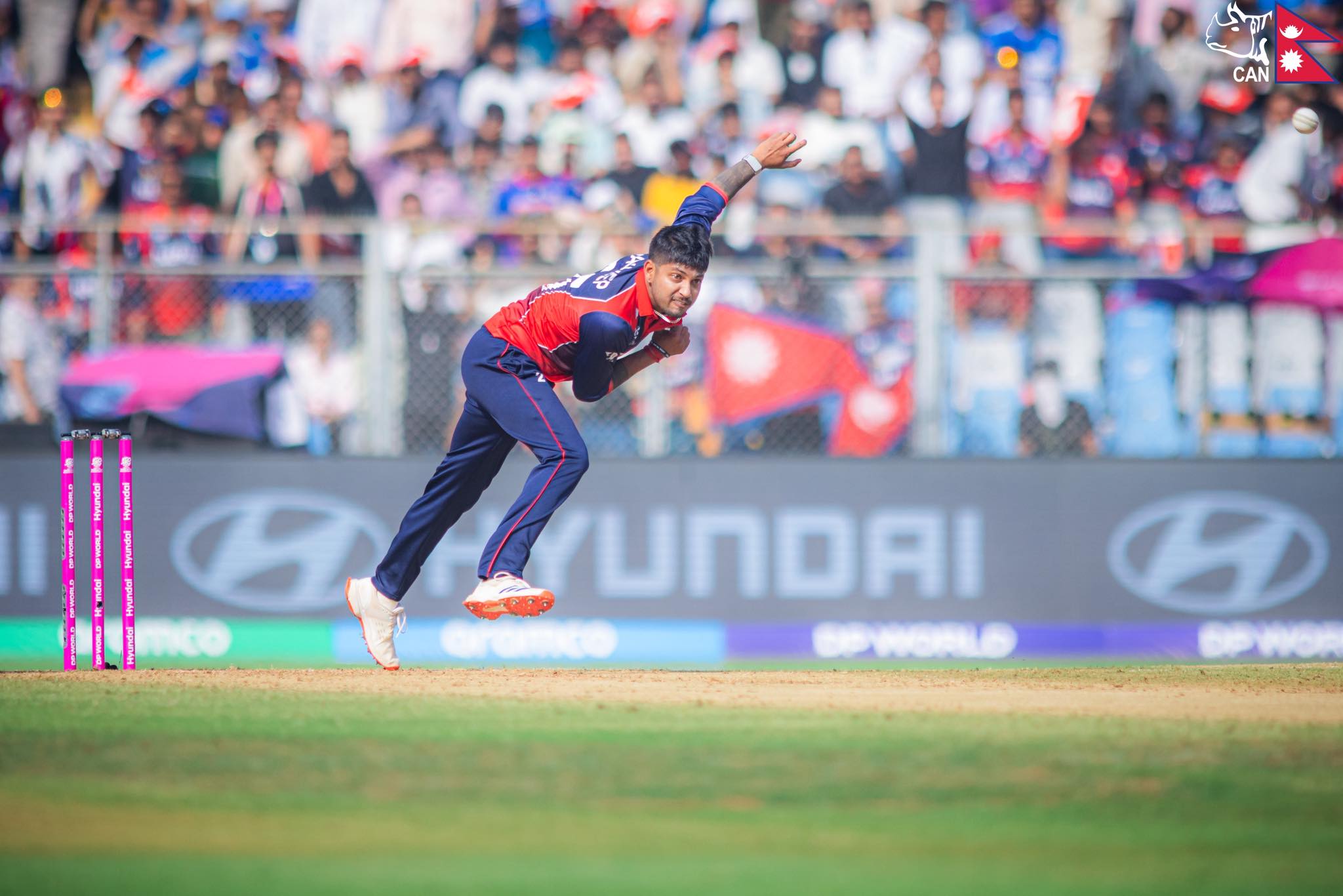 बलिङमा नेपालका दीपेन्द्रसिंह ऐरी र नन्दन यादवले दुई दुई तथा सन्दीप लामिछाने र शेर मल्लले एक एक विकेट लिनुभयो । यस खेलसँगै टी–२० विश्वकपमा शेर मल्लसहित आरिफ शेख, लोकेश बम र नन्दन यादवले डेब्यू गर्नुभएको छ ।