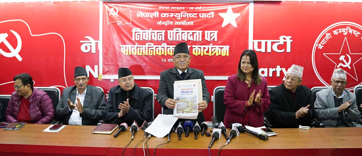 काठमाडौँ, माघ २७ गते । नेपाली कम्युनिस्ट पार्टी (नेकपा)ले आगामी ५ वर्षभित्र वार्षिक १० प्रतिशतभन्दा माथिको आर्थिक वृद्धिदर हासिल गर्ने लक्ष्यसहित आज आफ्नो प्रतिबद्धता पत्र सार्वजनिक गरेको छ । पार्टी कार्यालय पेरिसडाँडामा आयोजित कार्यक्रममा सार्वजनिक गरिएको प्रतिबद्धता पत्रमा सो अवधिमा बहुआयामिक गरिबीको दर २०.१५ प्रतिशतबाट घटाएर ५ प्रतिशतमा झार्ने लक्ष्य प्रस्तुत गरिएको छ ।