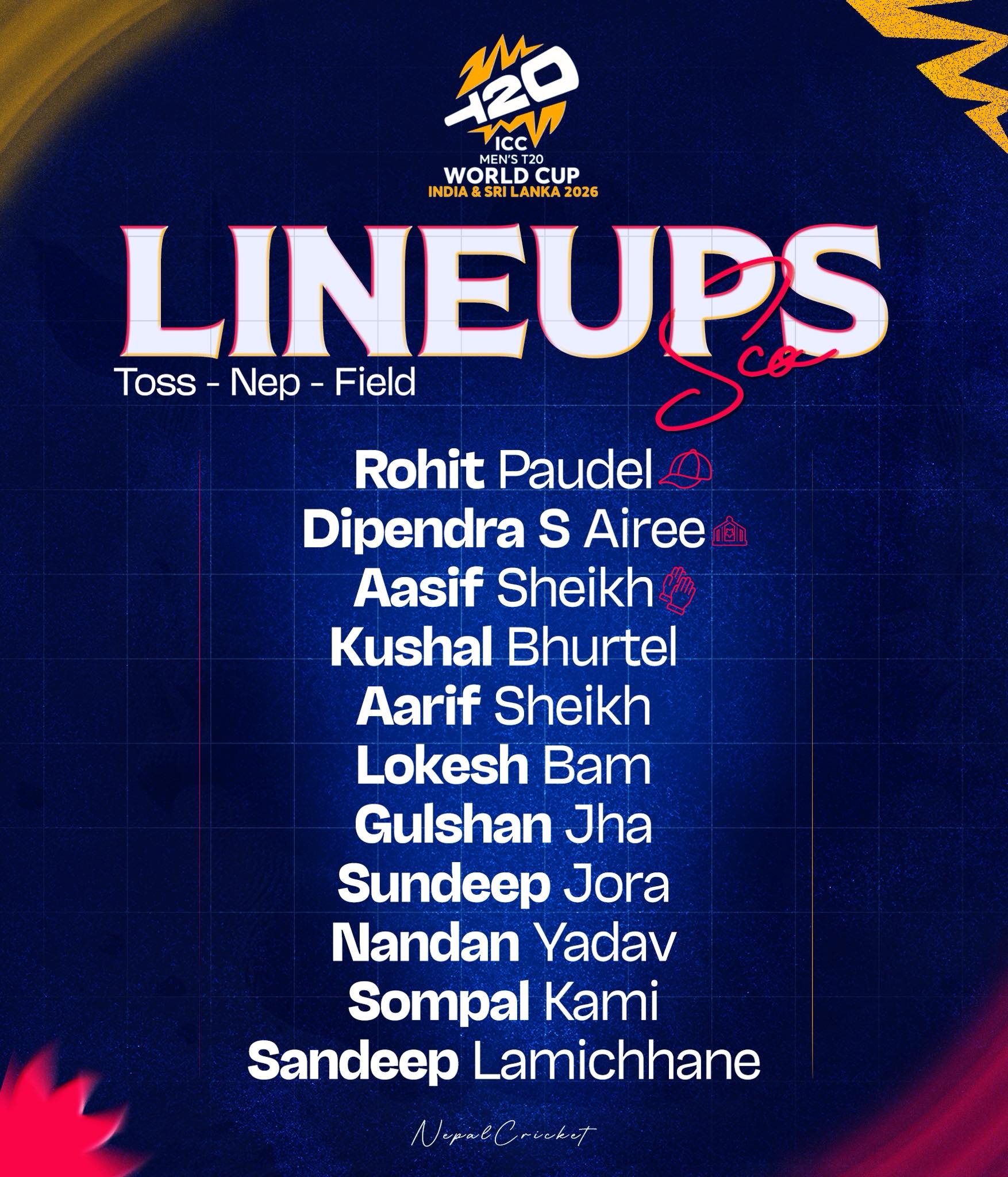 काठमाडौँ, फागुन ५ गते । आईसीसी टी–२० विश्वकप अन्तर्गत अहिले हुन लागेको खेलमा नेपालले सुरुमा फिल्डिङ गर्दैछ । भारतको मुम्बईस्थित वानखेडे रङ्गशालामा टस जितेर नेपालका कप्तान रोहित पौडेलले फिल्डिङ गर्ने निर्णय गर्नुभएको हो ।