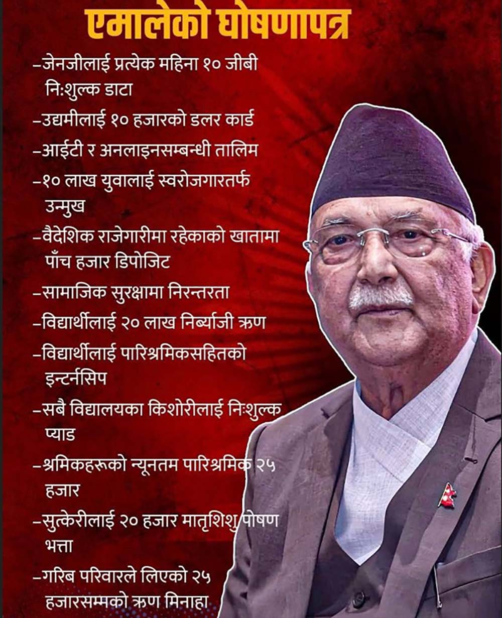 पूर्व प्रधानमन्त्री एवम् नेकपा (एमाले) को अध्यक्ष केपी शर्मा ओलीको सन्देशसहित सार्वजनिक भएको घोषणापत्रमा ‘परिकल्पना र प्रतिबद्धता, विकासका लागि आधारभूत घोषणा’, ‘तुलनामा २०४७ अघि र पछिको विकास’, ‘तथ्यले भन्छ, एमाले विकासको संवाह हो, एमालेले गर्छ’, ‘हामी गर्छौं’, ‘एमालेले बनाउँछ !’ लगायतका मुख्य विषय रहेका छन् ।