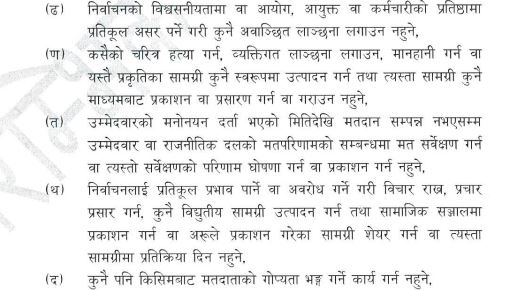 मतदानको अघिल्लो ४८ घण्टादेखि मतदानको दिन मतदान केन्द्र बन्द नहुन्जेलसम्म राजनीतिक दल वा उम्मेदवारको पक्ष वा विपक्षमा विज्ञापनका अतिरिक्त टक सो, टिप्पणी, विश्लेषण, प्रश्नोत्तरजस्ता कार्यक्रम गर्न नहुने, निर्वाचनको बारेमा नकारात्मक सन्देश प्रवाह गर्ने लेख, तस्विर वा समाचार प्रकाशन वा प्रसारण गर्न हुँदैन ।