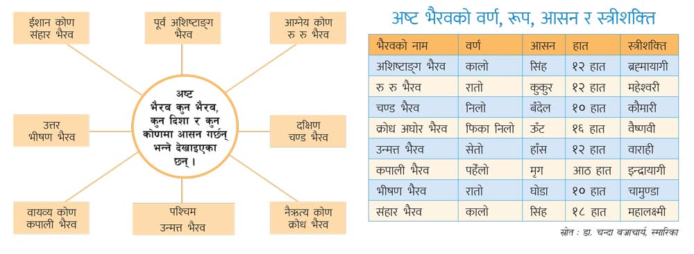 नेपाल मण्डलभित्र हरेक नगर निर्माणमा शक्तिका प्रतीक देवदेवीको स्थापना गरिएको पाइन्छ । नगरको सुरक्षार्थ मातृशक्तिका देवी र भैरव नै स्थापना गरिएको छ । प्रत्येक नगरको चार दिशा र चार कोणमा अष्टमातृका देवी र अष्ट भैरव नै बढी देखिन्छ । अष्ट भैरव विशेष गरी मण्डपको चारैतर्फ आसन गरेको हुन्छ । अष्टमातृका देवीको विभिन्न रूप वर्ण विभिन्न आसन भए जस्तै अष्ट भैरवको पनि विभिन्न रूप, विभिन्न वर्ण, विभिन्न आसन र स्त्रीशक्ति पनि हुन्छ ।