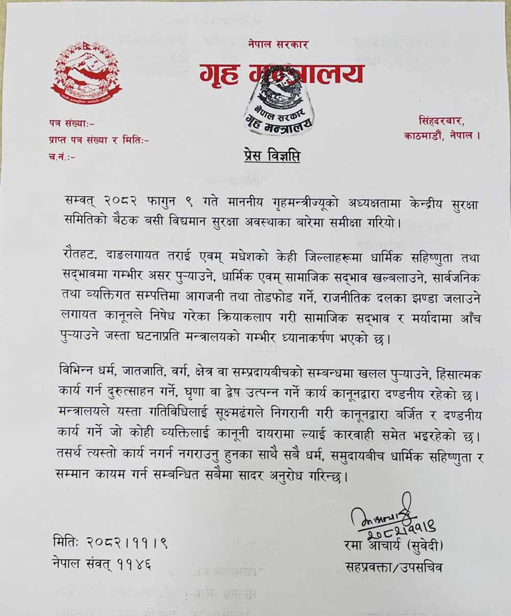 गृह मन्त्रालयका सहप्रवक्ता रमा आचार्य सुवेदीले शनिबार साँझ विज्ञप्ति सार्वजनिक गर्नुहुँदै रौतहट, दाङलगायत केही जिल्लामा धार्मिक सहिष्णुता तथा सद्भाव गम्भीर असर पुर्‍याउने, धार्मिक सद्भाव खल्बल्याउने, राजनीतिक दलका झण्डा जलाउनेलगायत कानुनले निषेध गरेका क्रियाकलाप गरेर सामाजिक सद्भाव र मर्यादामा आँच पुर्‍याउने घटना भएकोप्रति मन्त्रालयको ध्यानाकर्षण भएको उल्लेख गर्नुभएको छ ।