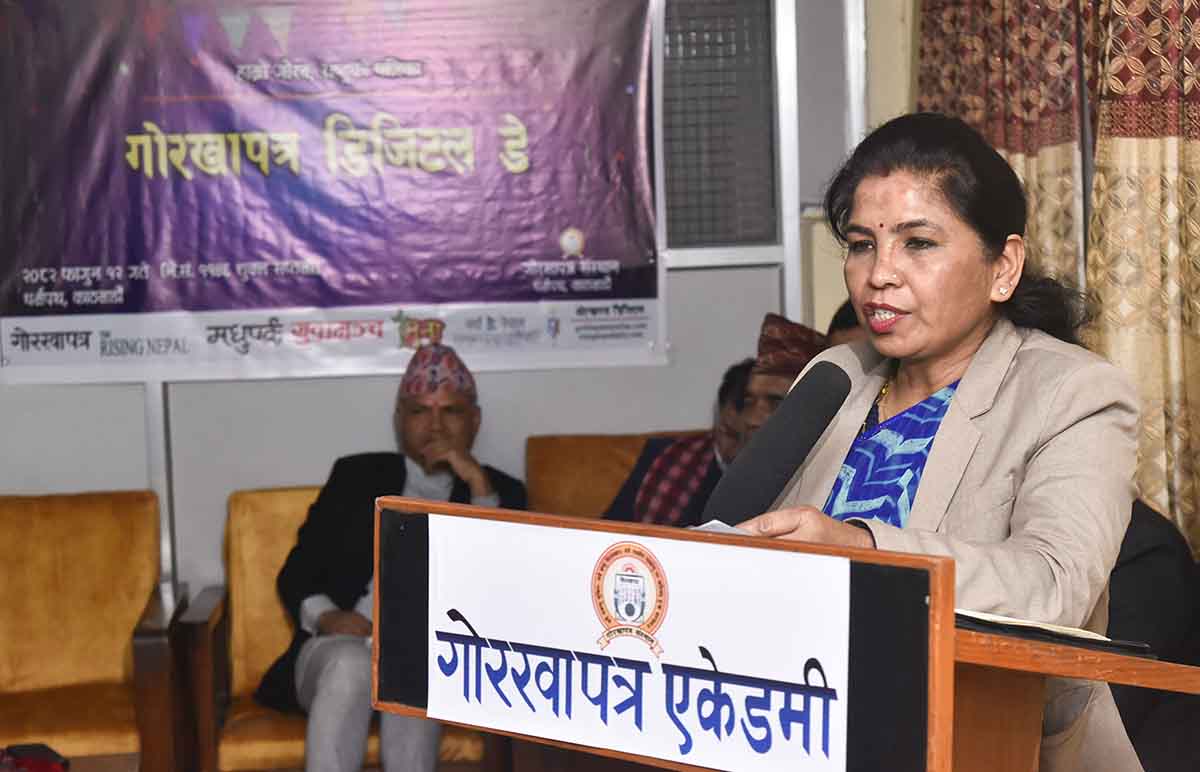 काठमाडौँ, फागुन १२ गते । सञ्चार तथा सूचना प्रविधि मन्त्रालयका सचिव लक्ष्मीकुमारी बस्नेतले डिजिटल युगमा प्रवेश गर्नु समयको माग भएको बताउनुभएको छ । गोरखापत्र संस्थानको डिजिटल प्रकाशन (गोरखापत्र अनलाइन र दी राइजिङ नेपाल डेली डटकम) को २९ औं वार्षिकोत्सवको अवसरमा आयोजित कार्यक्रमलाई सम्बोधन गर्दै उहाँले यस्तो बताउनुभएको हो ।