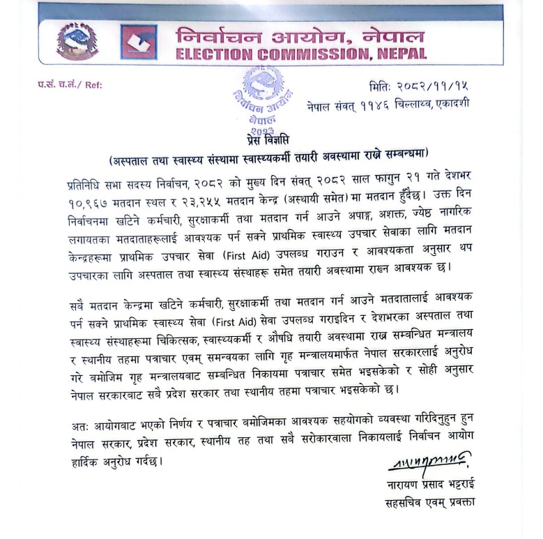 काठमाडौँ, फागुन १५ गते । निर्वाचन आयोगले आगामी फागुन २१ गते हुने प्रतिनिधि सभा सदस्य निर्वाचनका लागि स्वास्थ्यकर्मी र अस्पताललाई तयारी अवस्थामा राख्न निर्देशन दिएको छ । आयोगले शुक्रबार एक प्रेस विज्ञप्ति जारी गर्दै मतदानका दिन देशभरका १० हजार ५६७ मतदान स्थल र २३ हजार ५१५ मतदान केन्द्रमा प्राथमिक स्वास्थ्य उपचार सेवा सुनिश्चित गर्न सरकारलाई आग्रह गरेको हो ।