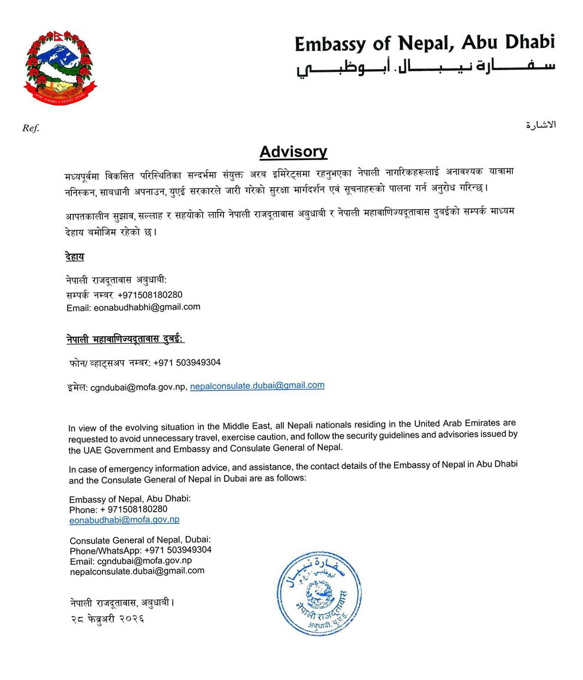 दूतावासले शनिबार  ‘ट्राभल एडभाइजरी’ जारी गर्दै युएई सरकारले जारी गरेका सुरक्षा मार्गदर्शन एवं सूचनाको पूर्ण पालना गर्न आग्रह गरेको छ । आपत्कालीन सुझाव, सल्लाह वा सहयोगका लागि अबुधाबीस्थित नेपाली राजदूतावास र दुबईस्थित नेपाली महावाणिज्यदूतावासको सम्पर्कमा रहन अनुरोध गरिएको छ ।
