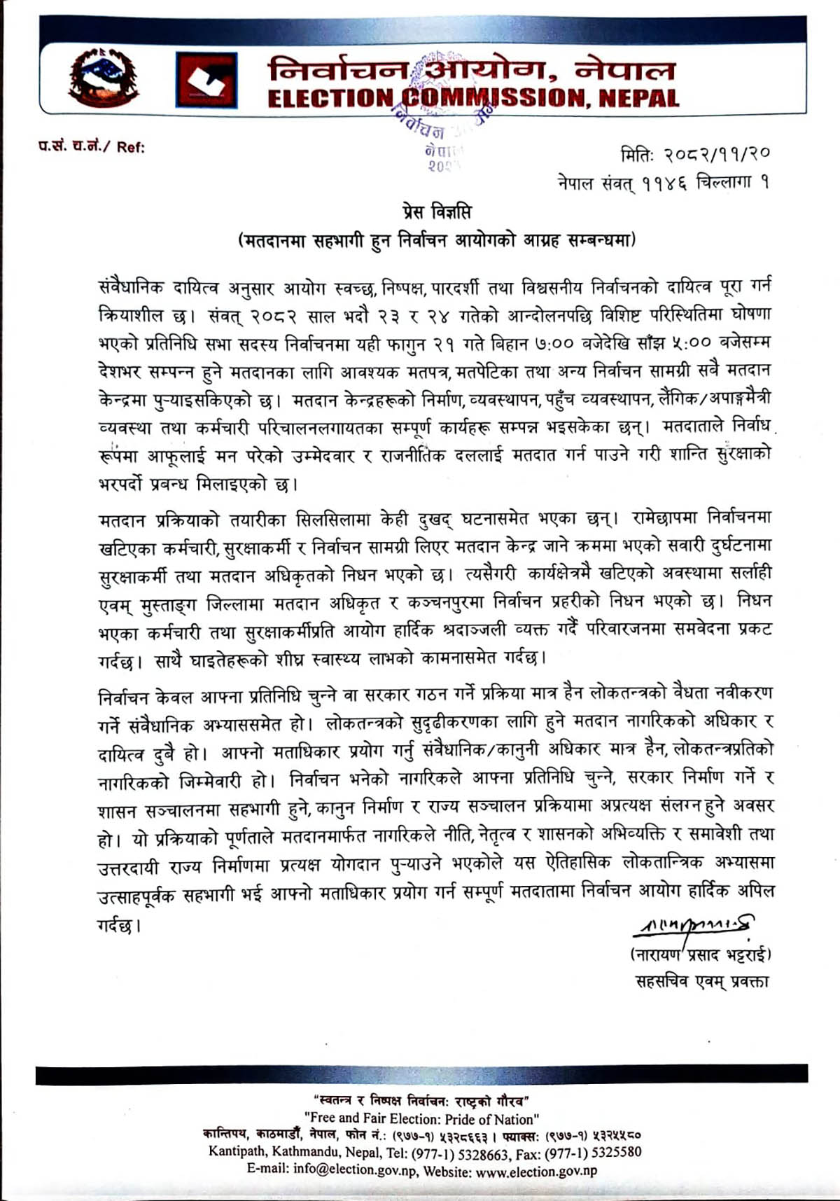 आयोगका सहसचिव एवम् प्रवक्ता नारायणप्रसाद भट्टराईले मतदानमार्फत नागरिकले नीति, नेतृत्व, शासनको अभिव्यक्ति र समावेशी तथा उत्तरदायी राज्य निर्माणमा प्रत्यक्ष योगदान पुर्याउने भएकोेले यस ऐतिहासिक लोकतान्त्रिक अभ्यासमा उत्साहपूर्वक सहभागी हुन आग्रह गर्नुभयो ।
