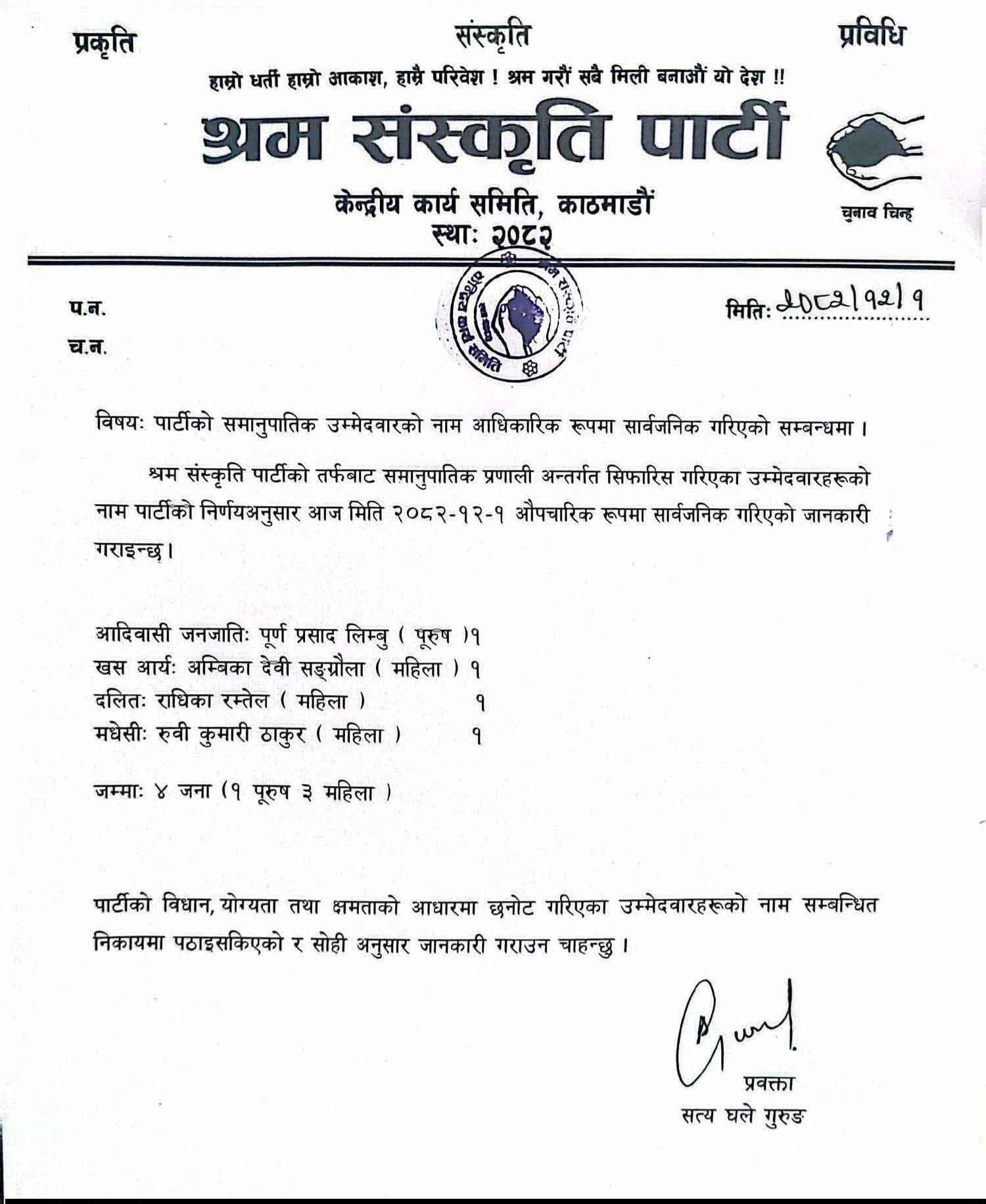 काठमाडौँ, चैत १ गते । श्रम संस्कृति पार्टीले समानुपातिक प्रणालीअन्तर्गत सिफारिस गरिएका उम्मेदवारको नाम आधिकारिक रूपमा सार्वजनिक गरेको छ । पार्टी केन्द्रीय कार्यसमितिको निर्णयअनुसार आइतबार नामावली सार्वजनिक गरेको हो ।