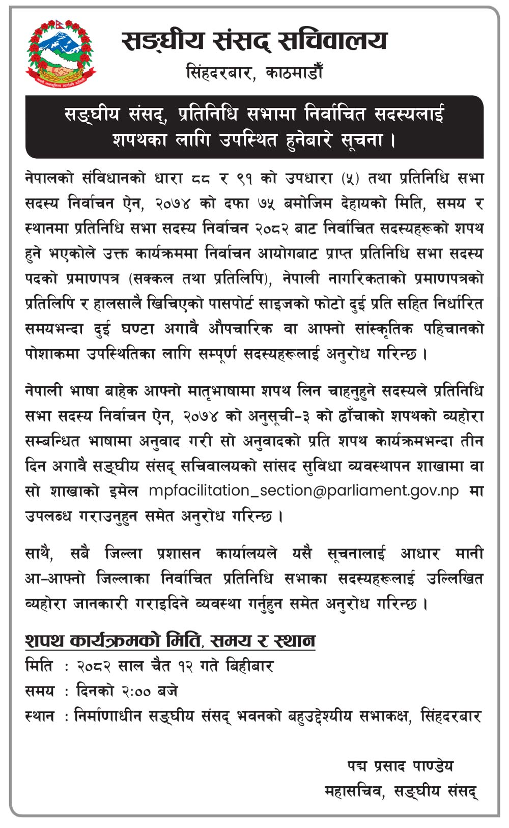 गोरखापत्रलाई प्राप्त सूचना अनुसार उक्त दिन दिनको २:०० बजे सिंहदरबारस्थित निर्माणाधीन सङ्घीय संसद् भवनको बहुउद्देश्यीय सभाकक्षमा सांसदलाई शपथका लागि आह्वान गरिएको छ । नेपालको संविधानको धारा ८८ र ९१ को उपधारा ५ तथा प्रतिनिधि सभा सदस्य निर्वाचन ऐन, २०७४ को दफा ७५ बमोजिम आह्वान गरिएको सूचनामा शपथका लागि निर्वाचन आयोगबाट प्राप्त प्रमाणपत्रहित उपस्थित हुन अनुरोध गरिएको छ ।