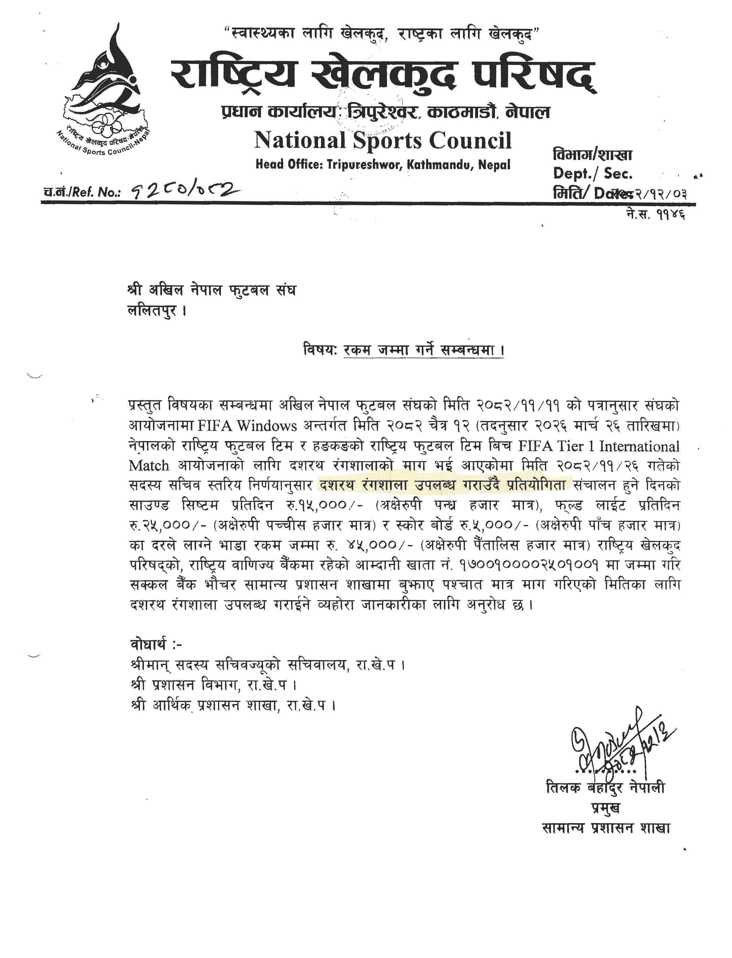 राखेपले खेलका लागि स्वीकृति दिएको र मैदान, फर्डलाइड, स्कोर बोर्ड र अन्य पूर्वाधार प्रयोगका लागि बैंकमा दस्तुर रकम जम्मा गर्न पत्राचार गरेकोसमेत उल्लेख गरेको छ ।