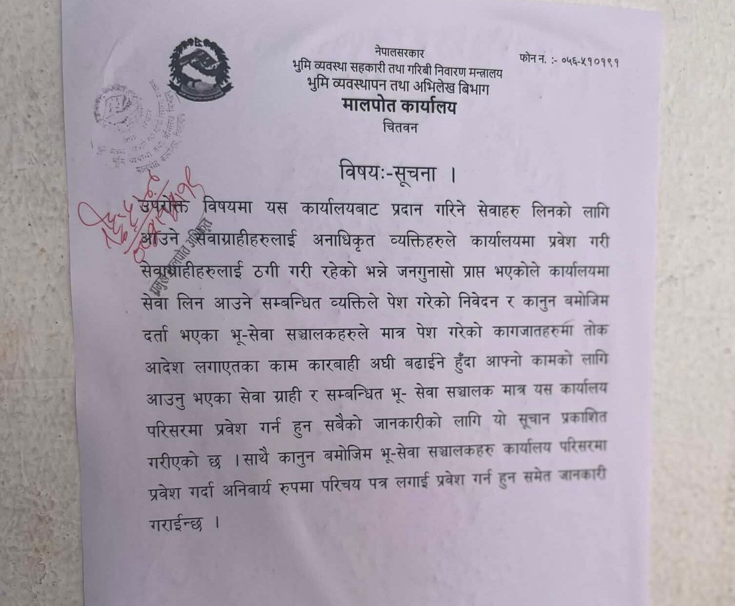 बिचौलियाको बिगबिगी बढेपछि मालपोत कार्यालय भरतपुरले एक सूचना जारी गर्दै अनधिकृत व्यक्तिहरूको प्रवेशमा पूर्ण रोक लगाएको छ। कार्यालयले अबदेखि सेवा लिन आउने सम्बन्धित जग्गाधनी वा हकवाला र कानुनबमोजिम दर्ता भएका 'भू-सेवा सञ्चालक'हरूलाई मात्र कार्यालय परिसरमा प्रवेश दिइने स्पष्ट पारेको छ।