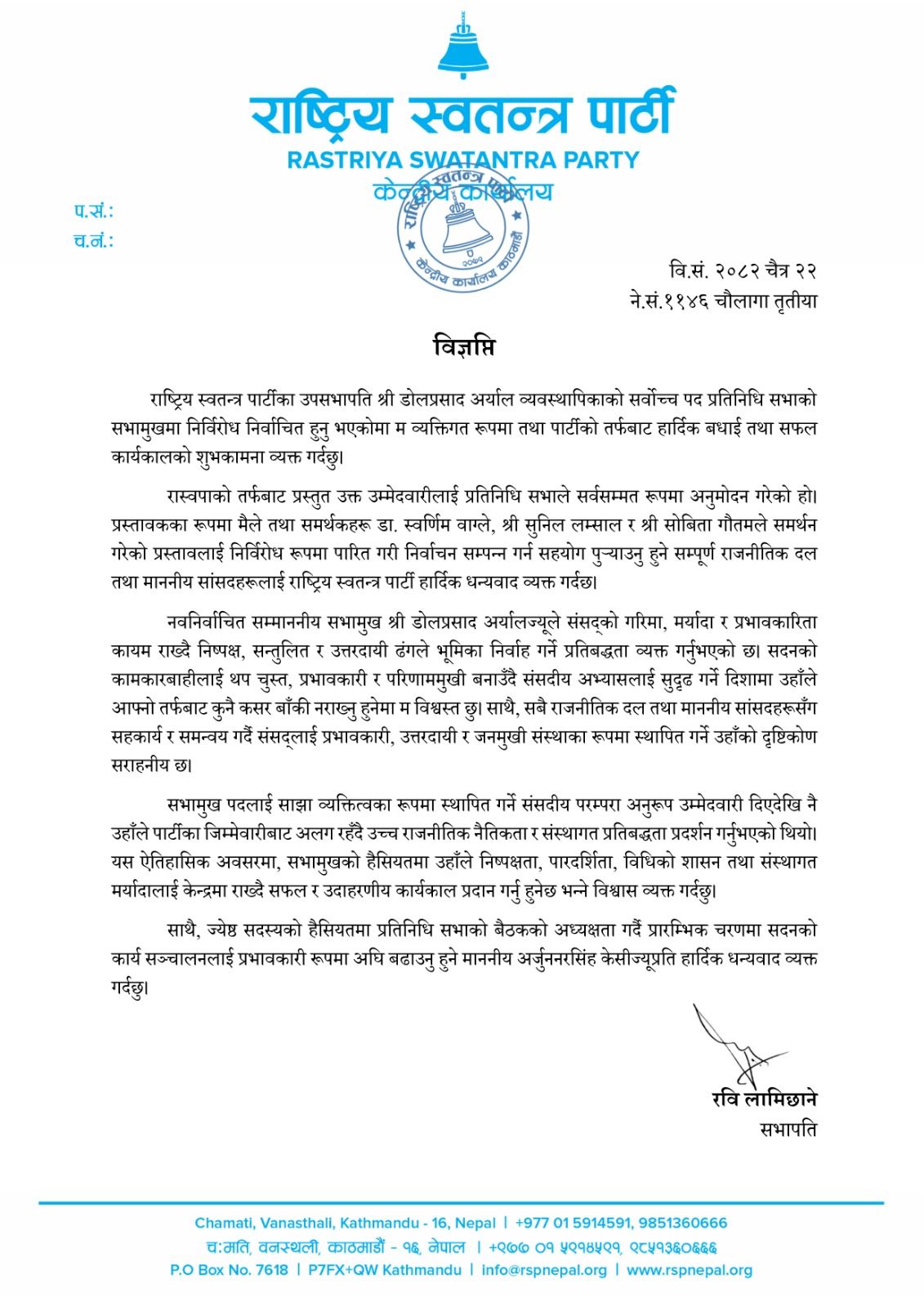 साथै, रास्वपाले ज्येष्ठ सदस्यका रूपमा प्रतिनिधि सभाको बैठकको अध्यक्षता गर्दै सदनको प्रारम्भिक कार्य सञ्चालनलाई प्रभावकारी रूपमा अघि बढाउनुभएकोमा अर्जुननरसिंह केसीबीप्रति धन्यवाद व्यक्त गरेको छ ।