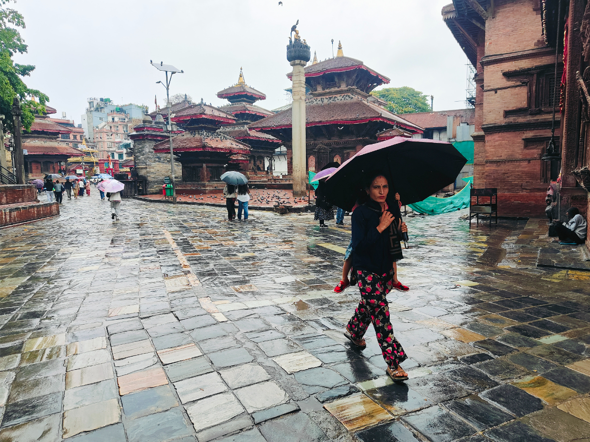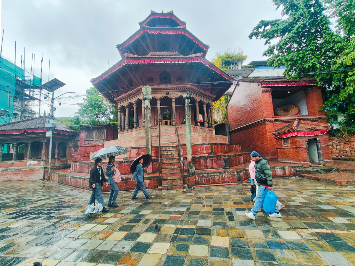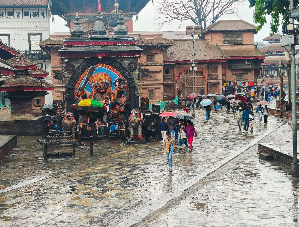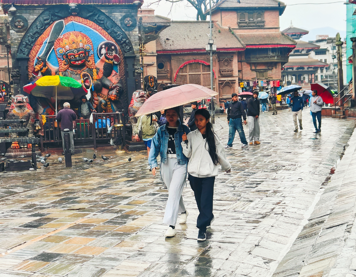 बुधबार दिउँसो वर्षा भइरहेका बेला वसन्तपुर क्षेत्रमा छाता ओढेर आफ्नो गन्तव्यतर्फ जाँदै गरेका सर्वसाधारण । तस्बिर: कविन अधिकारी