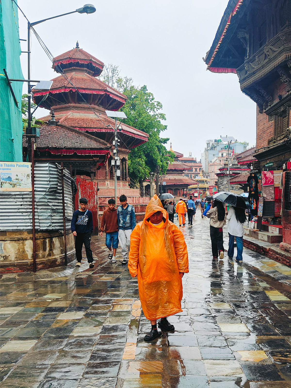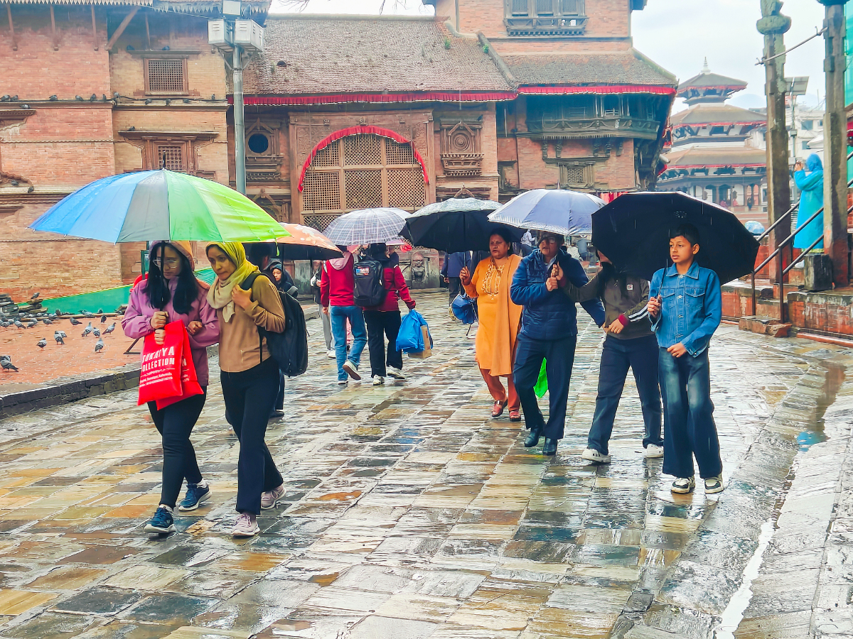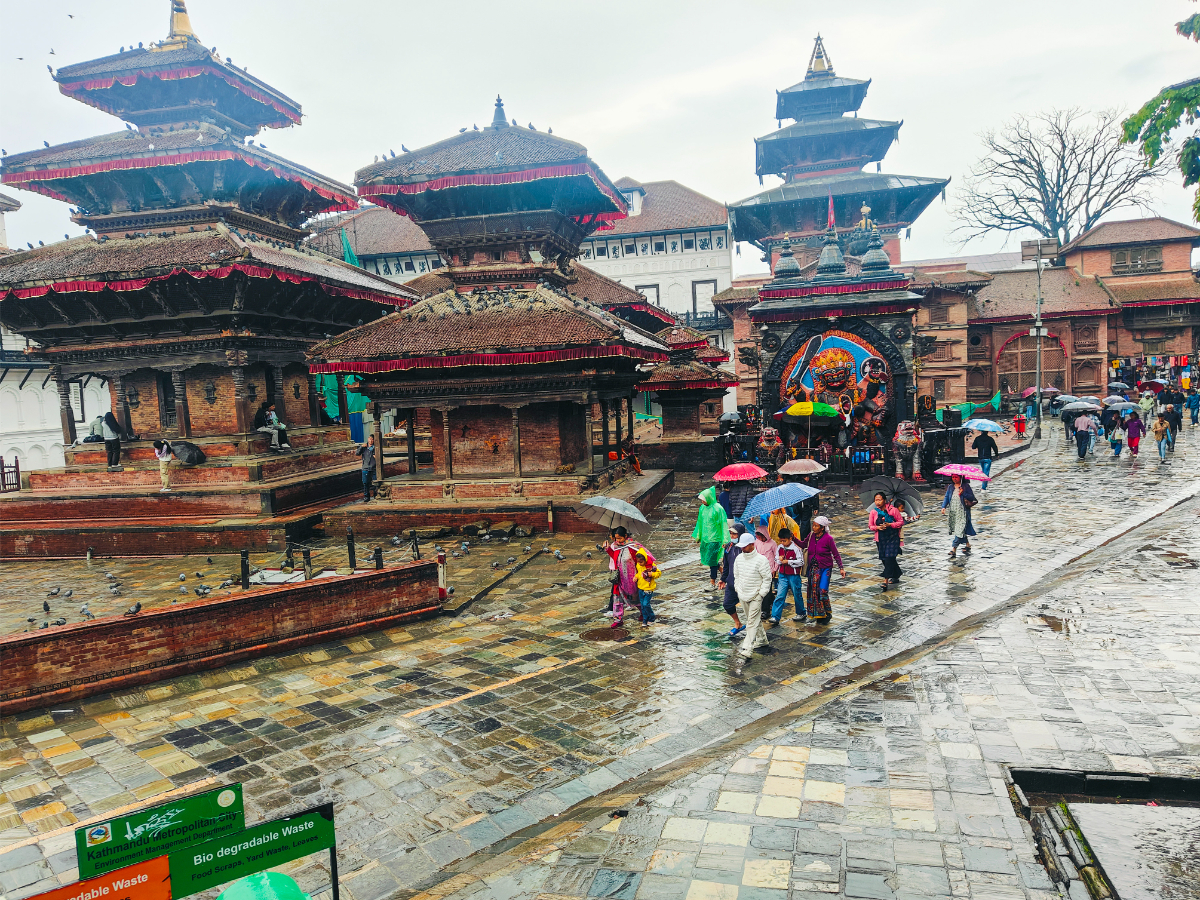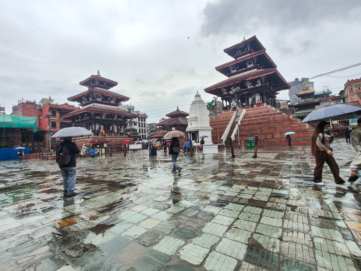 बुधबार दिउँसो वर्षा भइरहेका बेला वसन्तपुर क्षेत्रमा छाता ओढेर आफ्नो गन्तव्यतर्फ जाँदै गरेका सर्वसाधारण । तस्बिर: कविन अधिकारी