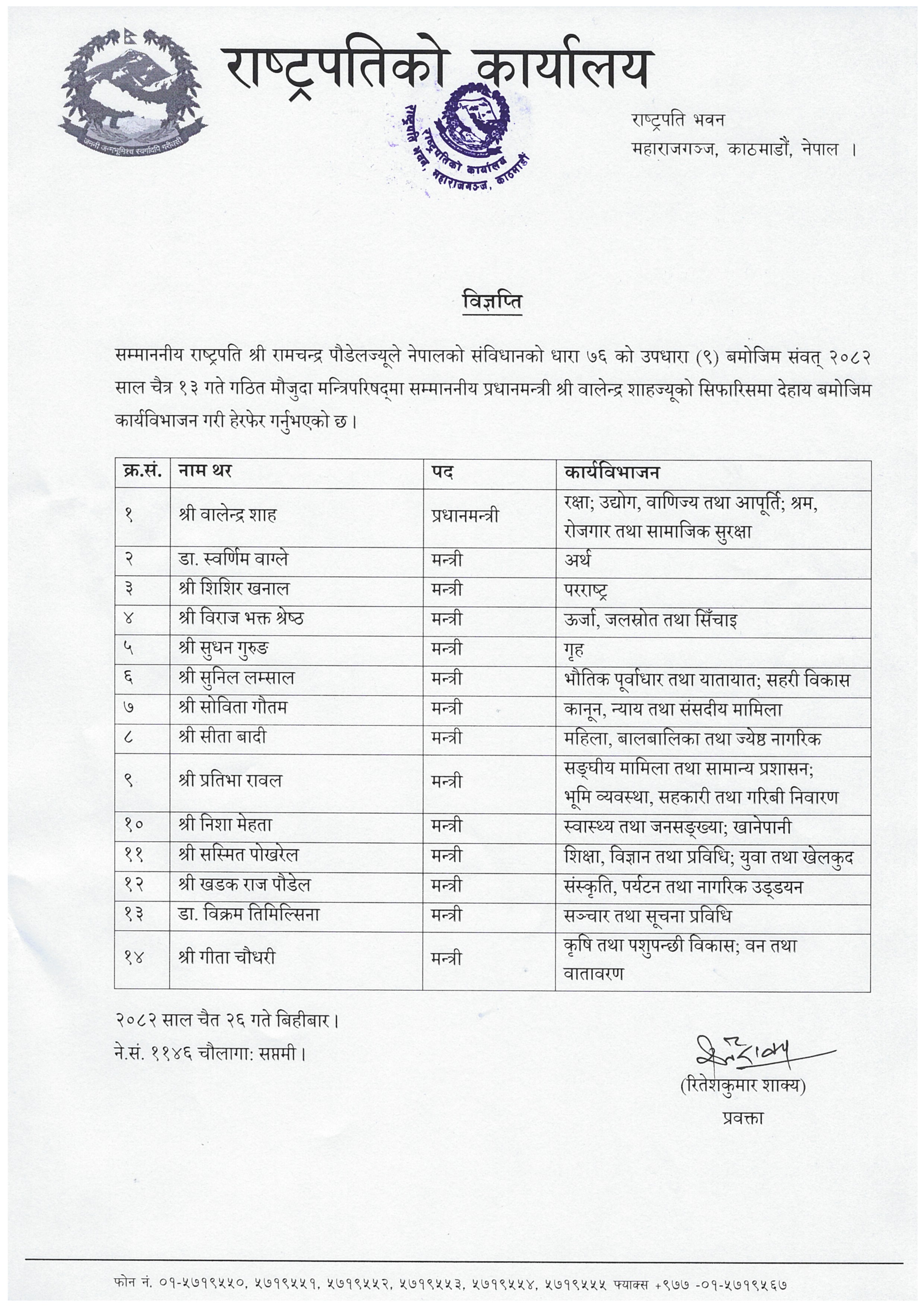 मन्त्री साह पदमुक्त भएपछि प्रधानमन्त्री बालेन्द्रले श्रम, रोजगार तथा सामाजिक सुरक्षा मन्त्रालयको जिम्मेवारी लिनुभएको हो । प्रधानमन्त्रीको सिफारिसमा राष्ट्रपति कार्यालयले मन्त्रीको जिम्मेवारी हेरफेर भएको जानकारी गराएको हो । राष्ट्रपति कार्यालयका प्रवक्ता रितेशकुमार शाक्यका अनुसार श्रम मन्त्रालयको जिम्मेवारी बिहीबारबाट प्रधानमन्त्रीले लिनुभएको हो ।