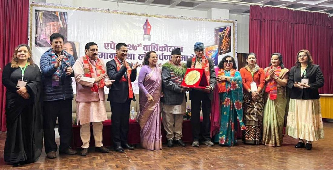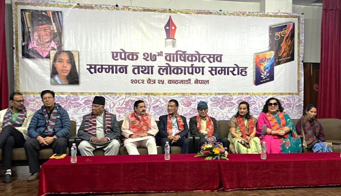 काठमाडौँ, चैत २८ गते । नेपाली भाषा साहित्यको क्षेत्रमा निरन्तर कार्यक्रम गर्दै आएको एपेक नेपालले नेपाल भारत दुई दिने काव्य महोत्सव सम्पन्न गरेको छ । नेपाली वाङमय जगतमा स्थापित एपेक नेपालले चैत २५ गते, नेपाली साहित्यको श्रीवृद्धिमा विगत २७ वर्षदेखि क्रियाशील रहेको संस्था ‘एपेक नेपाल’ को २७ औँ वार्षिकोत्सवको अवसरमा विश्व-ज्योति काव्य सम्मान २०८२ कवि मञ्जुललाई पर्यटन वोर्ड भृकुटी मण्डप काठमाडौँमा समर्पण गरिएको छ ।