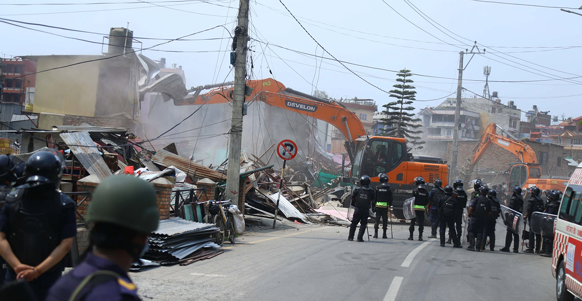 त्यहाँ सार्वजनिकस्थल अतिक्रमण गरी निर्माण गरिएका संरचनाहरू तथा बस्तीहरू सरकारको निर्देशन अनुसार भत्काउने अभियान सुरु गरिएको हो ।