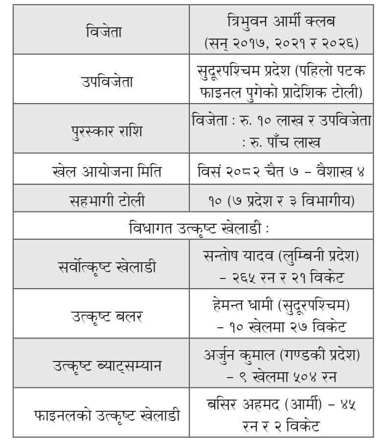 त्रिभुवन आर्मी क्लबले सुदूरपश्चिम प्रदेशलाई पाँच विकेटले हराउँदै अपराजित यात्राका साथ तेस्रो पटक प्रधानमन्त्री कप राष्ट्रिय क्रिकेटको उपाधि चुमेको ।