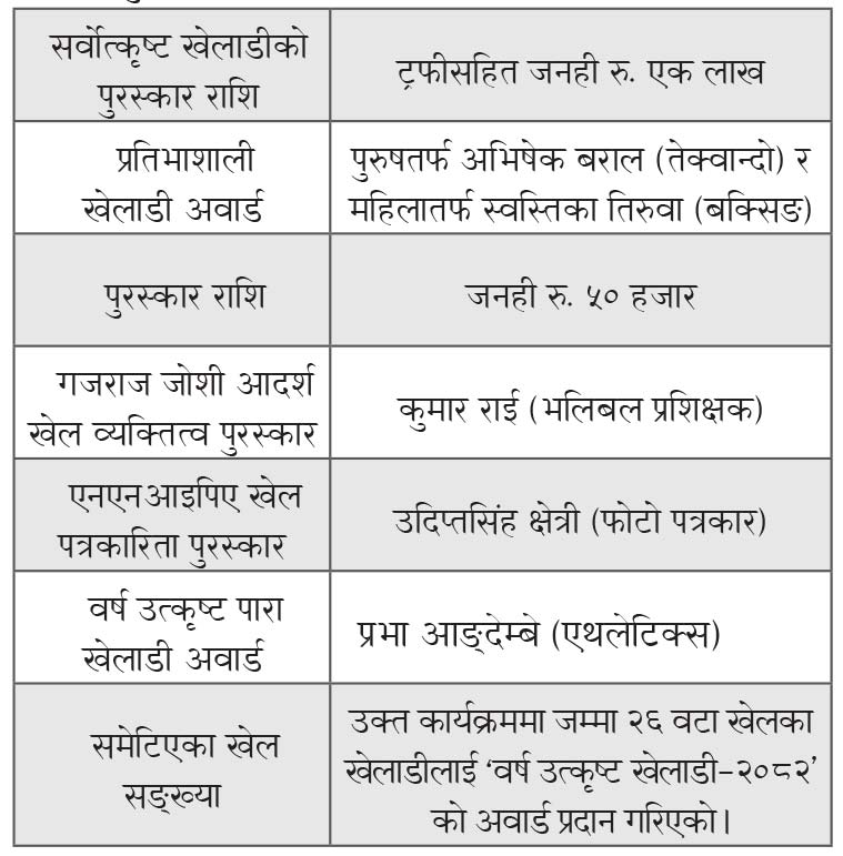 ७. २० औँ एनएनआइपिए स्पोट्र्स अवार्ड–२०८२ अन्तर्गत ‘सर्वोत्कृष्ट खेलाडी’ को अवार्डबाट सम्मानित हुने खेलाडी को को हुन् ?